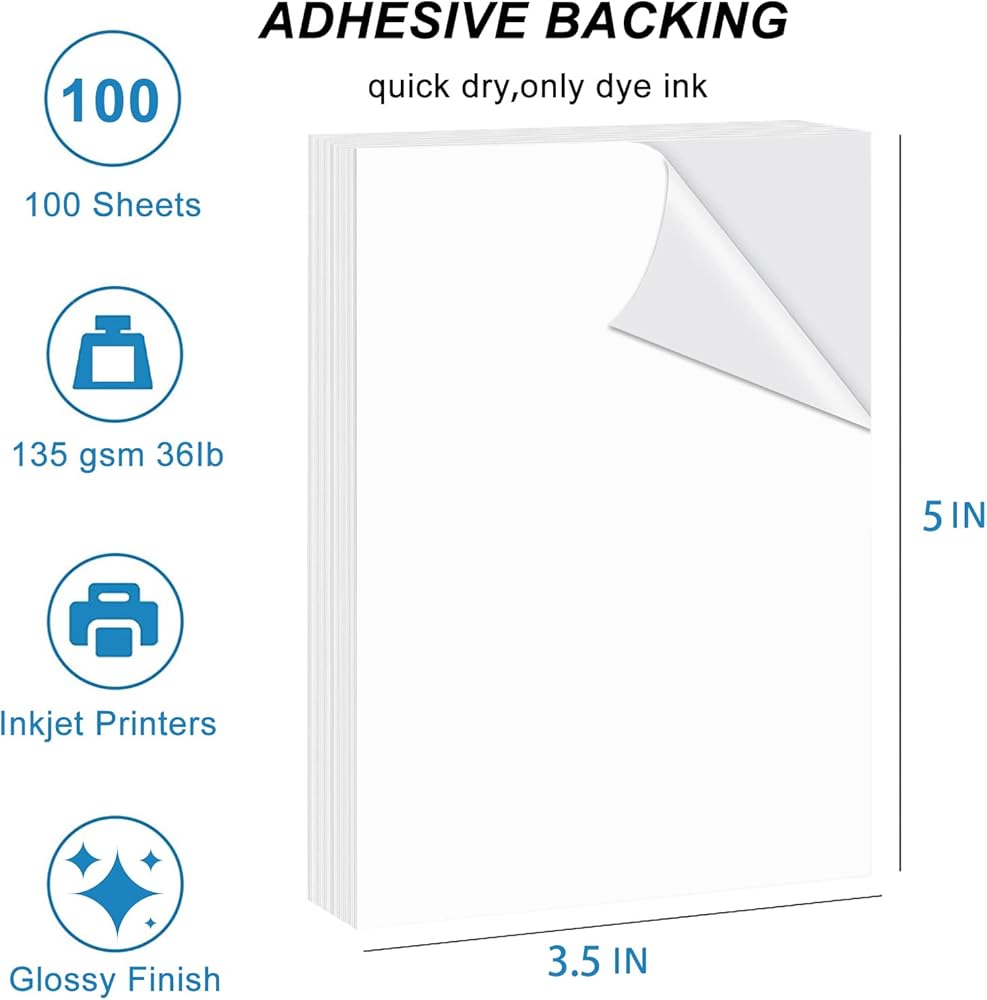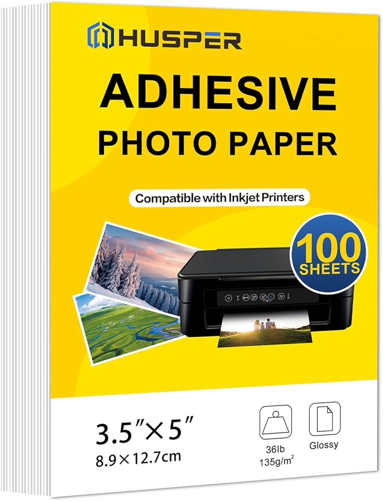 HUSPER 4x6 Glossy Sticker Paper for Inkjet Printers - 100 Sheets, 135gsm (Dye Ink Only) Create vibrant, peel-and-stick photos and decals with HUSPER's 4x6 inch glossy sticker paper! Optimized for dye-ink inkjet printers, this premium self-adhesive paper features a strong, permanent backing and brilliant glossy finish—perfect for crafts, photos, labels, and more. Key Features: 4x6 Inch Size - Fits standard photo printers and 4x6 paper trays Photo-Glossy Finish - Sharp, vibrant colors with a professional shine Permanent Adhesive - Sticks smoothly to laptops, journals, bottles, and other clean surfaces 135gsm Quality - Durable, no-bleed paper for crisp results Dye-Ink Optimized - Formulated for use with dye-based inkjet printers only Great for: Stickers & decals Photo stickers Scrapbooking Product labels & samples Craft projects Includes: 100 sheets of 4x6 inch glossy sticker paper. Note: For best results, use with dye-based inkjet printers. Select "Glossy Photo Paper" in print settings and allow ink to dry fully.
