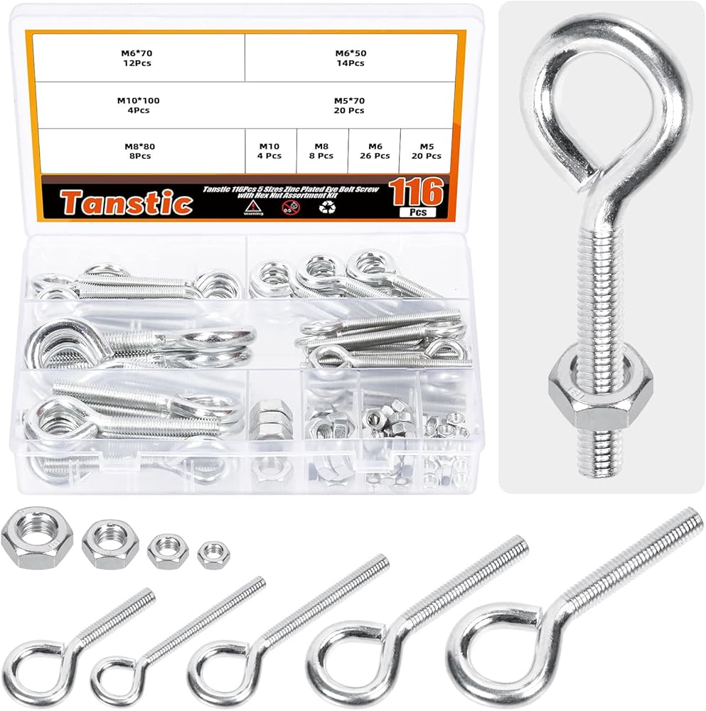 116 قطعة من مسمار العين من Tanstic مع مجموعة متنوعة من الصواميل، M5 M6 M8 M10 مطلي بالزنك من الفولاذ الكربوني ومسامير براغي مع صواميل سداسية