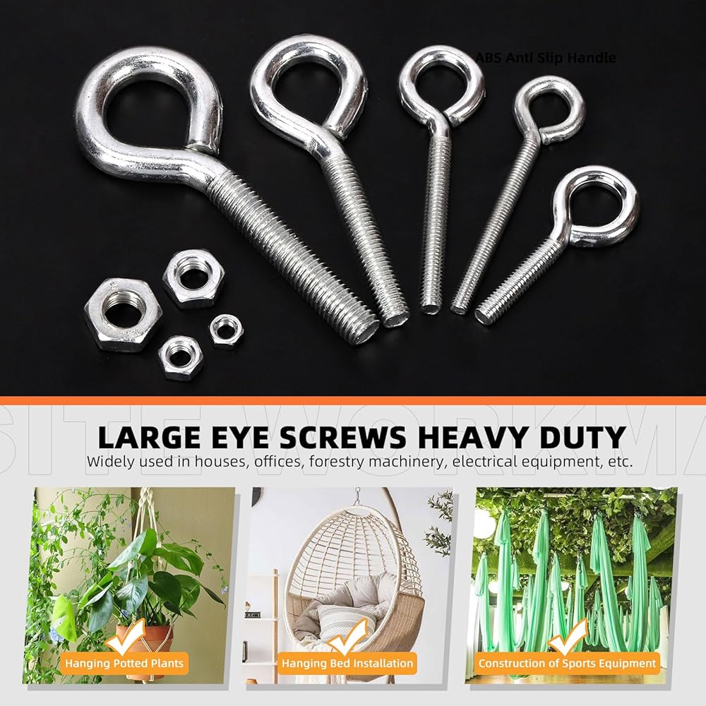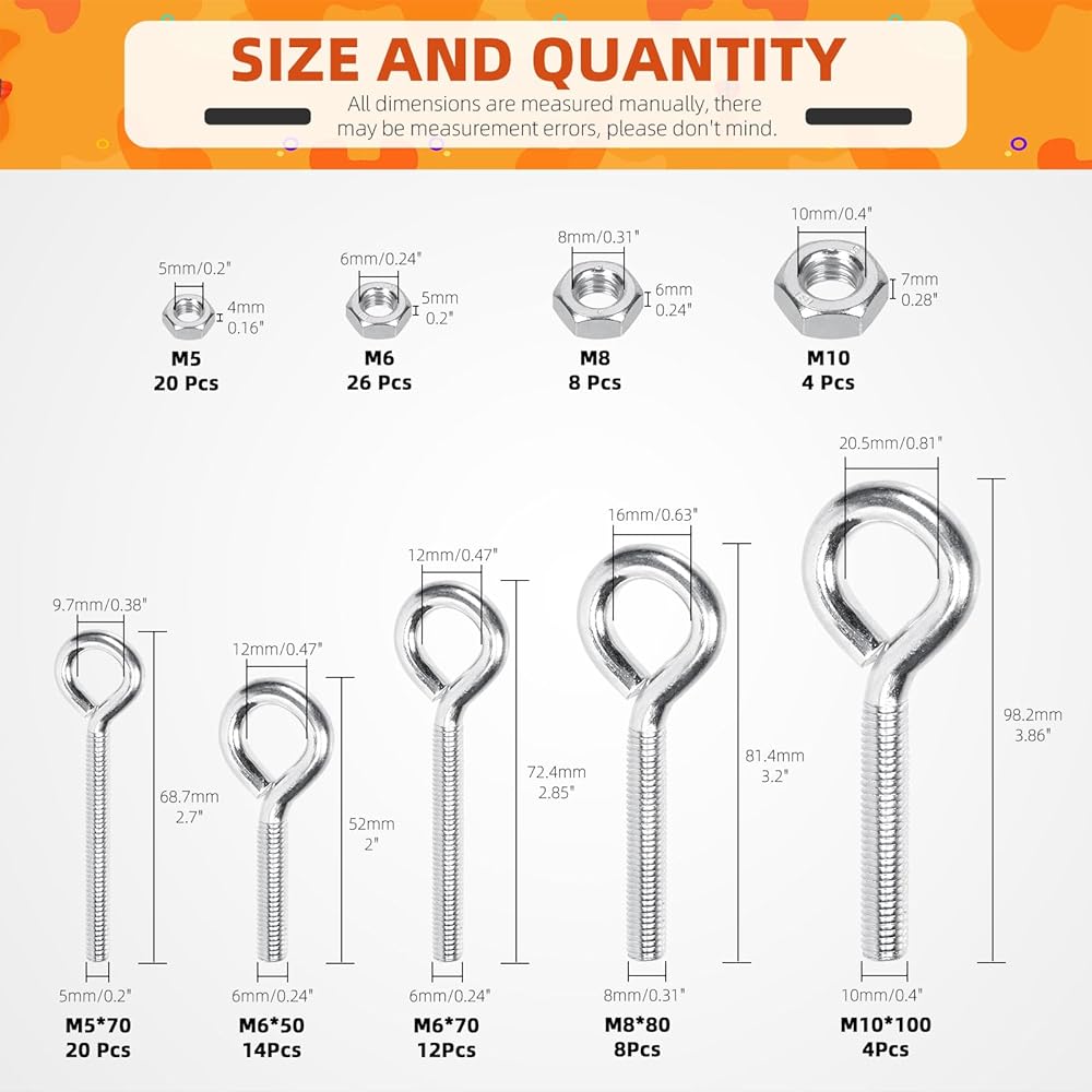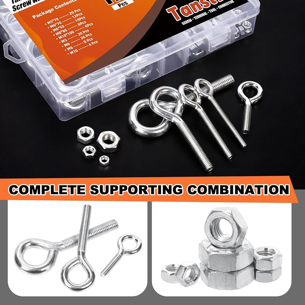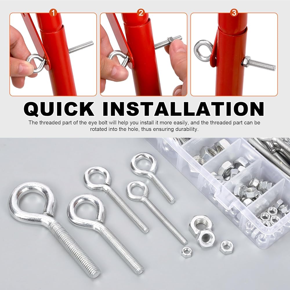 🏆 يمكن مطابقة أحجام البراغي ذات العين والصواميل السداسية معًا. حجم مختلف يمكن أن يوفر لك خيارات متعددة. بالإضافة إلى ذلك، يتم تعبئة جميع مسامير العين والصواميل السداسية جيدًا في صندوق شفاف مزود بشبكات لسهولة التخزين والحمل.