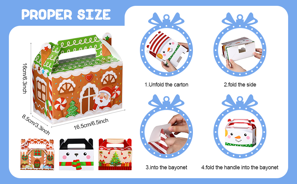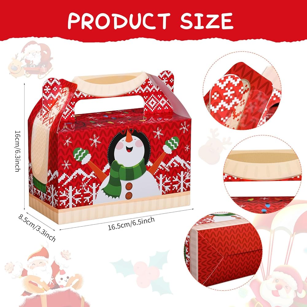 الحجم المثالي: يبلغ مقاس صناديق هدايا عيد الميلاد هذه تقريبًا. 15.8 × 9 × 9 سم/ 6.22 × 3.54 × 3.54 بوصة، حجم مناسب بمقبض مدمج، قابل للحمل لتغليف الحلوى والبسكويت والمعجنات والشوكولاتة والكعك والوجبات الخفيفة الأخرى لضيوفك، وهي أفضل حجم مثالي لحمل هدايا حفلات العطلات أو تغليف هدايا عيد الميلاد.