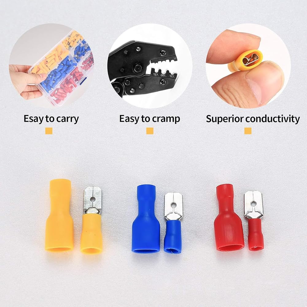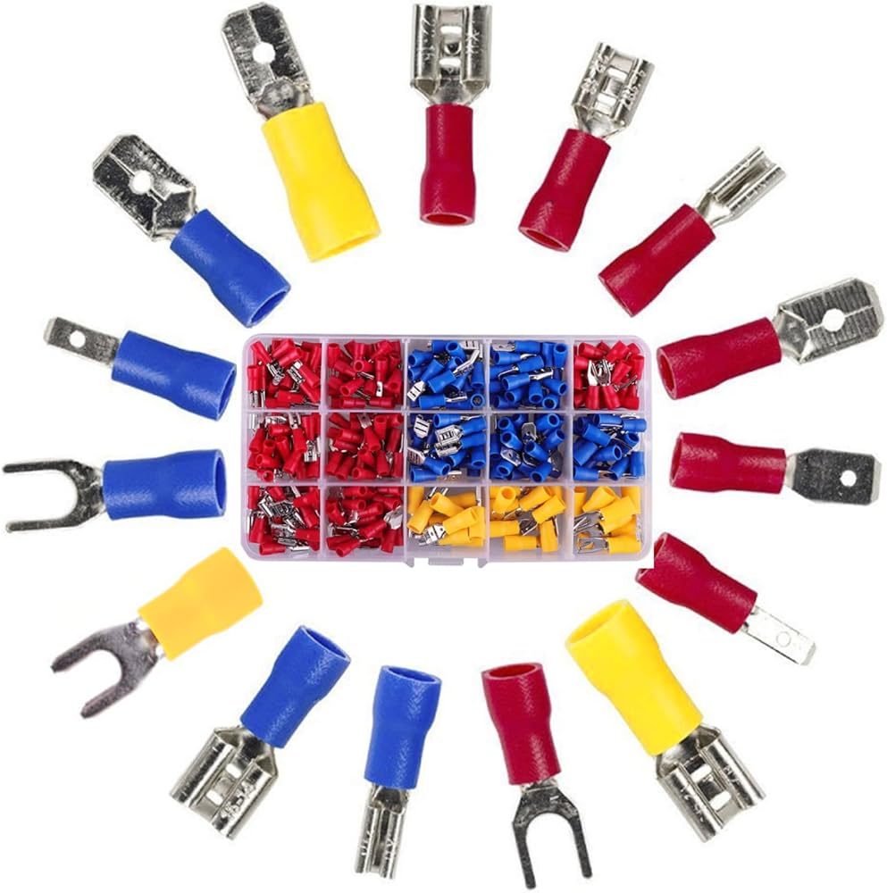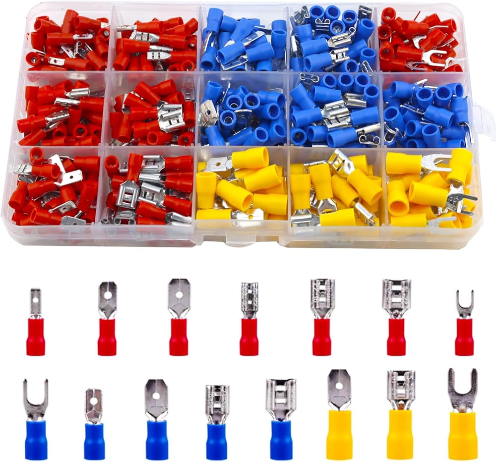 330 قطعة من أطراف توصيل الأسلاك المعزولة: تتضمن موصلات بأسمائها الحقيقية للذكور والإناث، وموصلات الشوكة، وموصلات المؤخرة. يأتي بثلاثة ألوان: الأحمر والأزرق والأصفر.