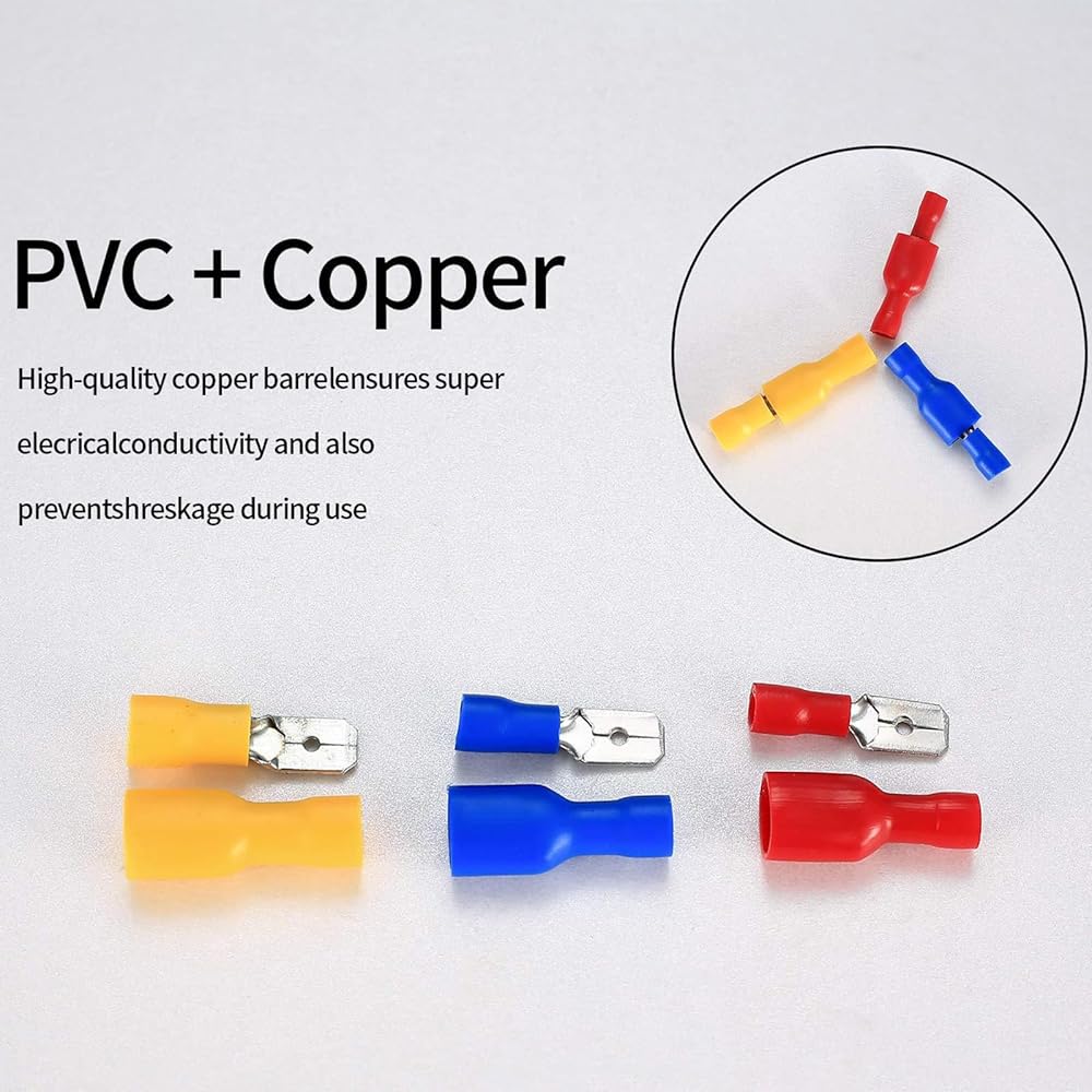 النحاس + الفينيل (PVC) + الصفيح: مادة نحاسية سميكة عالية الجودة مطلية بالقصدير تضمن أداء طويل الأمد وتضمن التوصيل الكهربائي الجيد. كم من النايلون الصلب العازل، مع البلاستيك، وشكل جميل بعد التجعيد، وتجعيد ثابت. من السهل الاتصال بالأسلاك الكهربائية وتعزيز موثوقيتها.