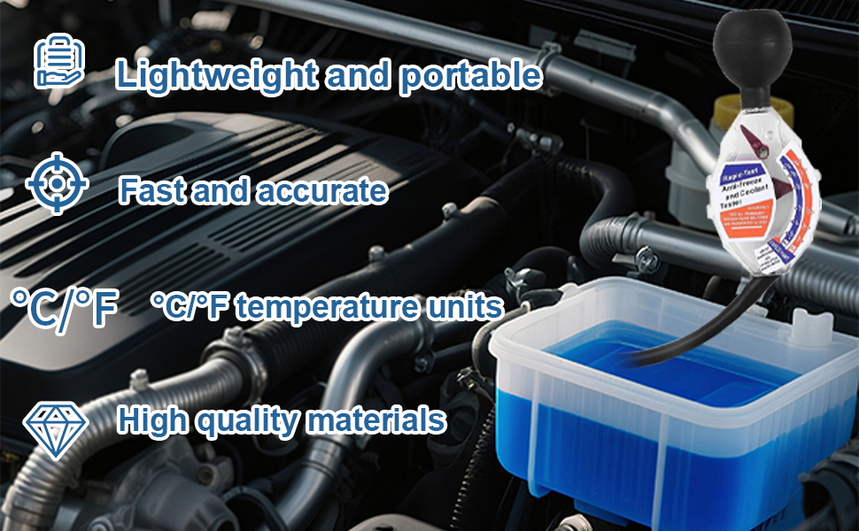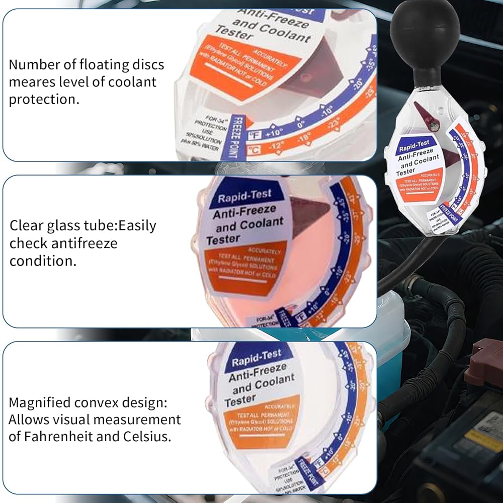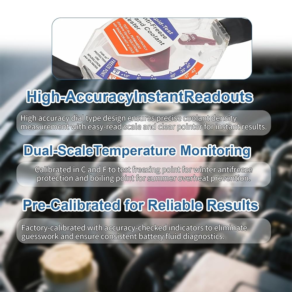 • وظائف فعالة: باعتباره اختبارًا أساسيًا لمضاد التجمد لفهم حالة سائل التبريد لديك، يقوم هذا المنتج بقياس تركيز مضاد التجمد ونقاط تجمد سائل التبريد بدقة. قم بحماية محركك من درجات الحرارة القصوى، خاصة خلال أشهر الشتاء الباردة، من خلال استخدام مقياس درجة حرارة سائل التبريد الموثوق به.