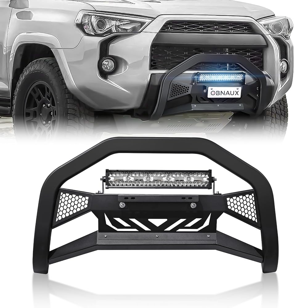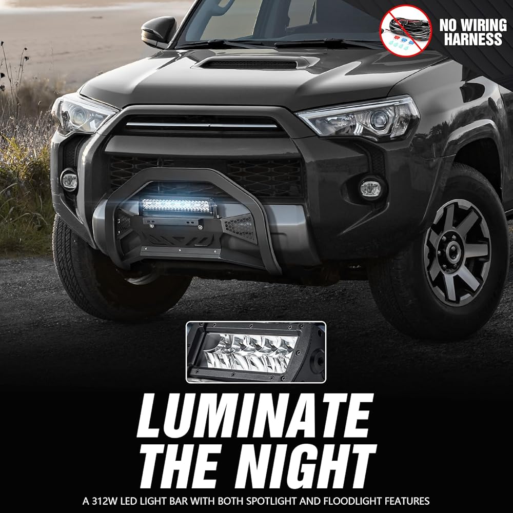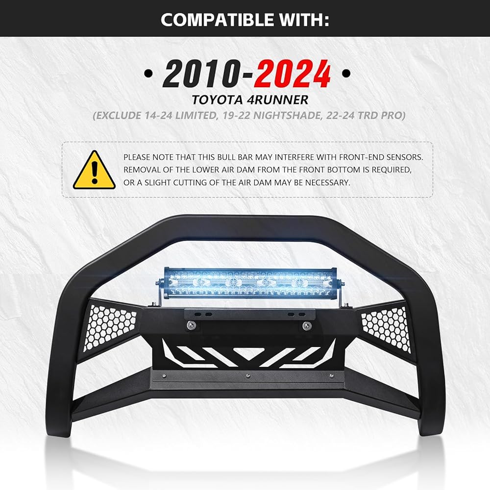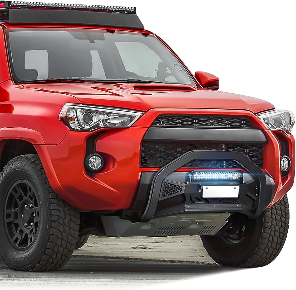 شريط Bull مع شريط إضاءة وإطار لوحة ترخيص متوافق مع 2010-2024 Toyota 4 Runner Front Brush Guard، شبكة حماية الشاحنة، شريط دفع ممتص الصدمات (يتضمن لوحة انزلاقية وحامل إضاءة، أسود)