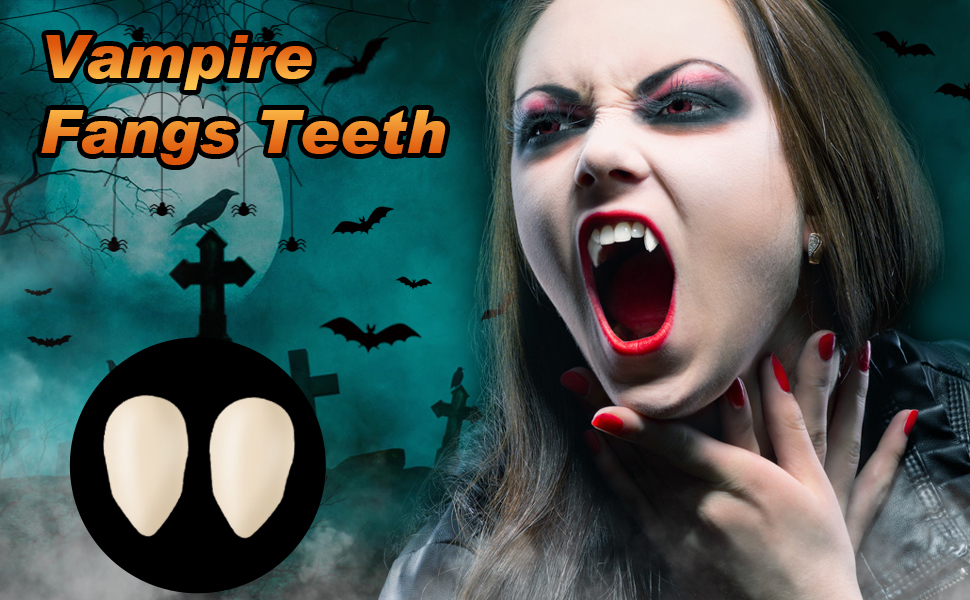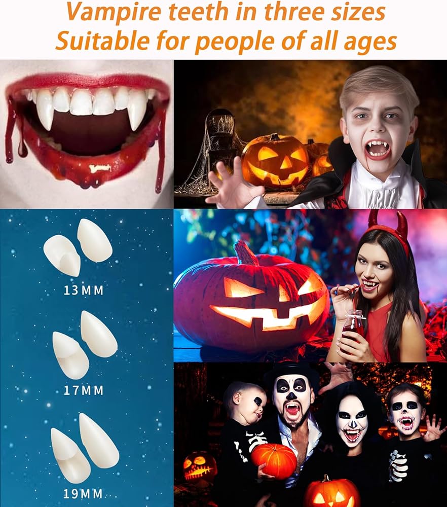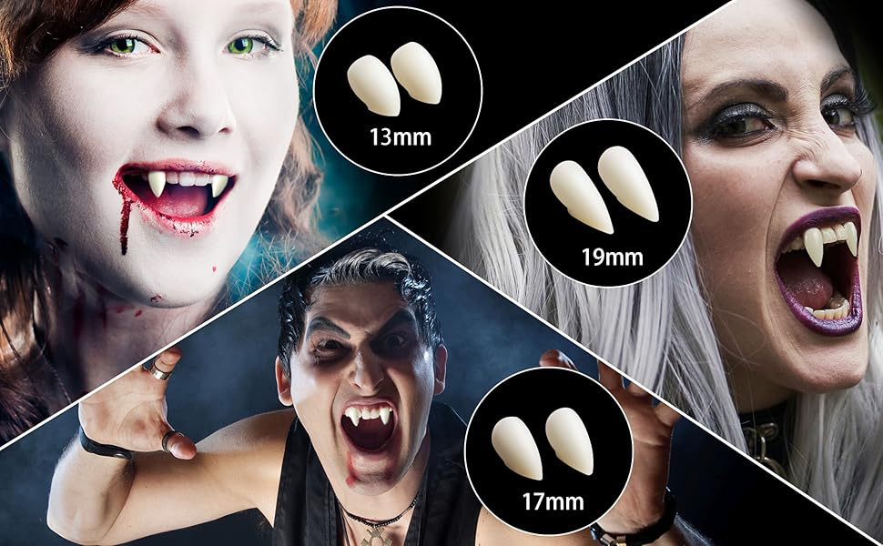 • أسنان مصاصي الدماء بثلاثة أحجام: أنياب مصاصي الدماء هذه للبالغين لها ثلاثة أحجام مختلفة 13، 17، 19 ملم، مناسبة للأشخاص من جميع الأعمار لاستخدامها في مصاصي الدماء في الهالوين وغيرها من لعب الأدوار.