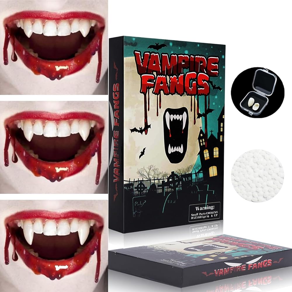 • التعبئة الفردية: يأتي كل زوج من أسنان مصاصي الدماء في صندوق صغير يسهل حمله وتخزينه. وهذا يضمن أيضًا إمكانية إعادة استخدام أنياب مصاصي الدماء عدة مرات.