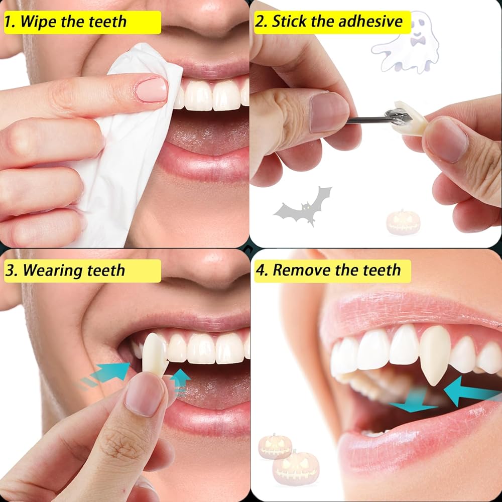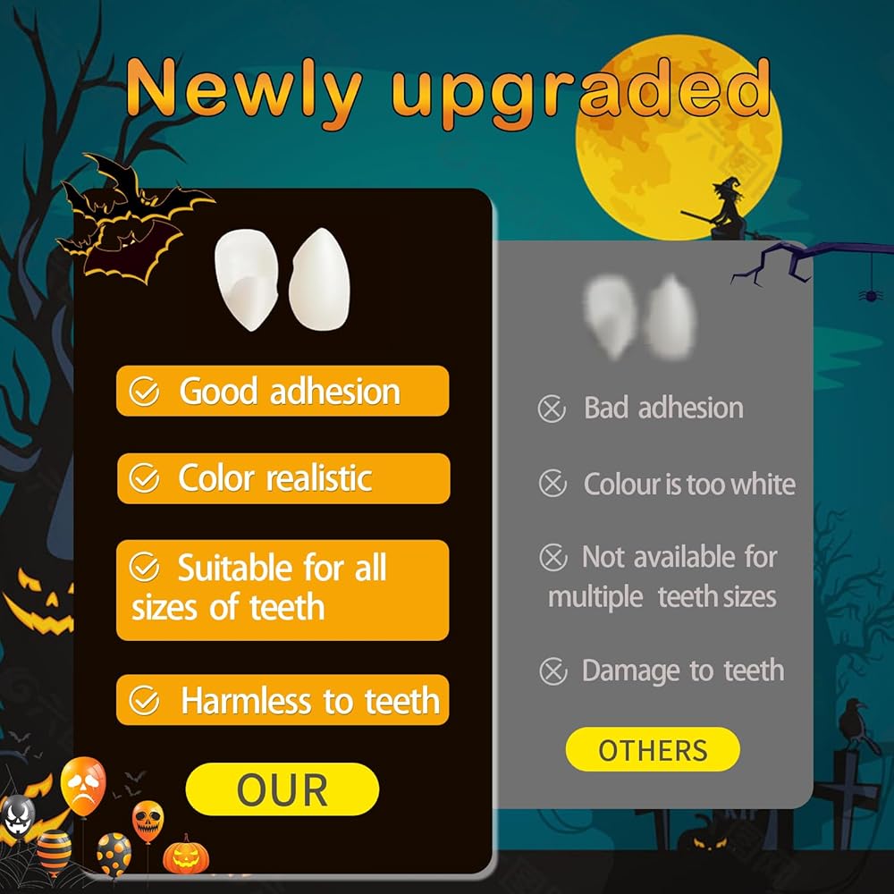 • مادة لاصقة مطورة قابلة لإعادة الاستخدام: تمت ترقية المادة اللاصقة الخاصة بنا لجعل أسنان مصاصي الدماء المزيفة هذه أكثر التصاقًا وتدوم لفترة أطول وأسهل في الإزالة من المنتجات الأخرى. بالإضافة إلى ذلك، يمكن إعادة استخدام كل من الأسنان اللاصقة ومصاصي الدماء. (يحتاج اللاصق إلى تسخينه في الماء الساخن قبل الاستخدام. بعد التسخين، يجب إكمال التثبيت في غضون 30 ثانية؛ وإلا فلن يحقق اللاصق التأثير المطلوب)