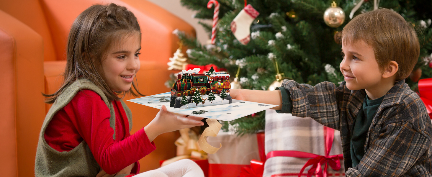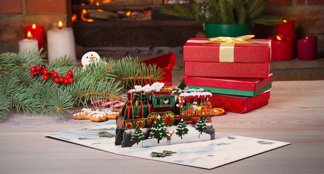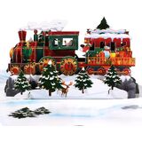تصميم عيد الميلاد ثلاثي الأبعاد غريب الأطوار: بطاقة عيد الميلاد المنبثقة ثلاثية الأبعاد تتميز بقطار عيد الميلاد المنبثق الاحتفالي الذي يسافر عبر المناظر الطبيعية الشتوية الثلجية، مما يخلق مشهدًا سحريًا للعطلات.