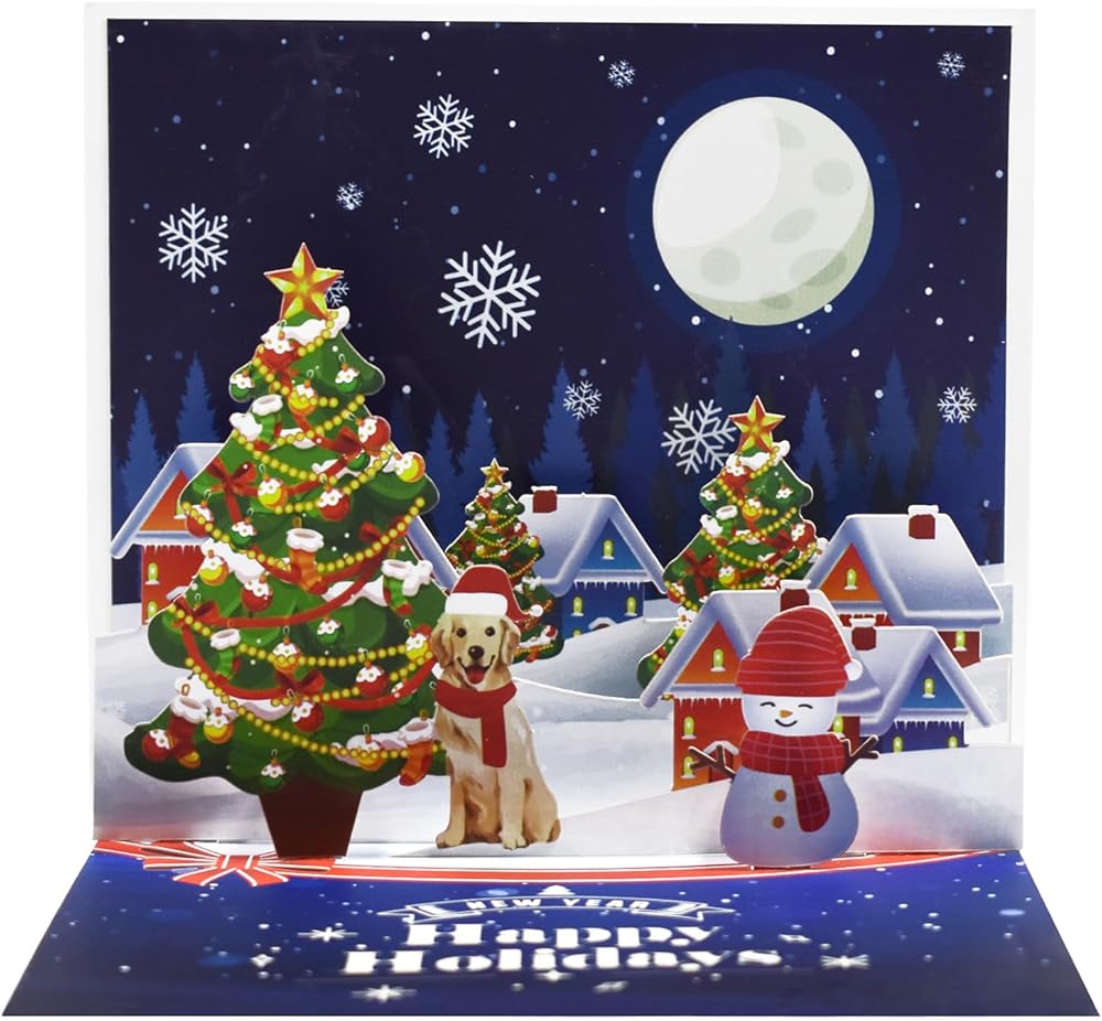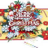 شخصيات العطلة الساحرة: تتضمن سانتا كلوز، ورجل الثلج، وحيوان الرنة كركاب، مما يضيف لمسة احتفالية مبهجة إلى بطاقة عيد الميلاد ثلاثية الأبعاد.