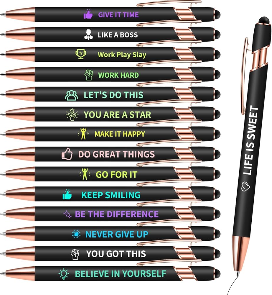 【15 لونًا، 15 نمطًا】احصل على الإلهام من خلال 15 قلمًا باللون الأسود، كل منها يحمل شعار اقتباس تحفيزي ملهم فريد. من الأسود إلى الأرجواني، ستحسن مجموعات الألوان الزاهية والجميلة من مزاجك وتمنحك الراحة.