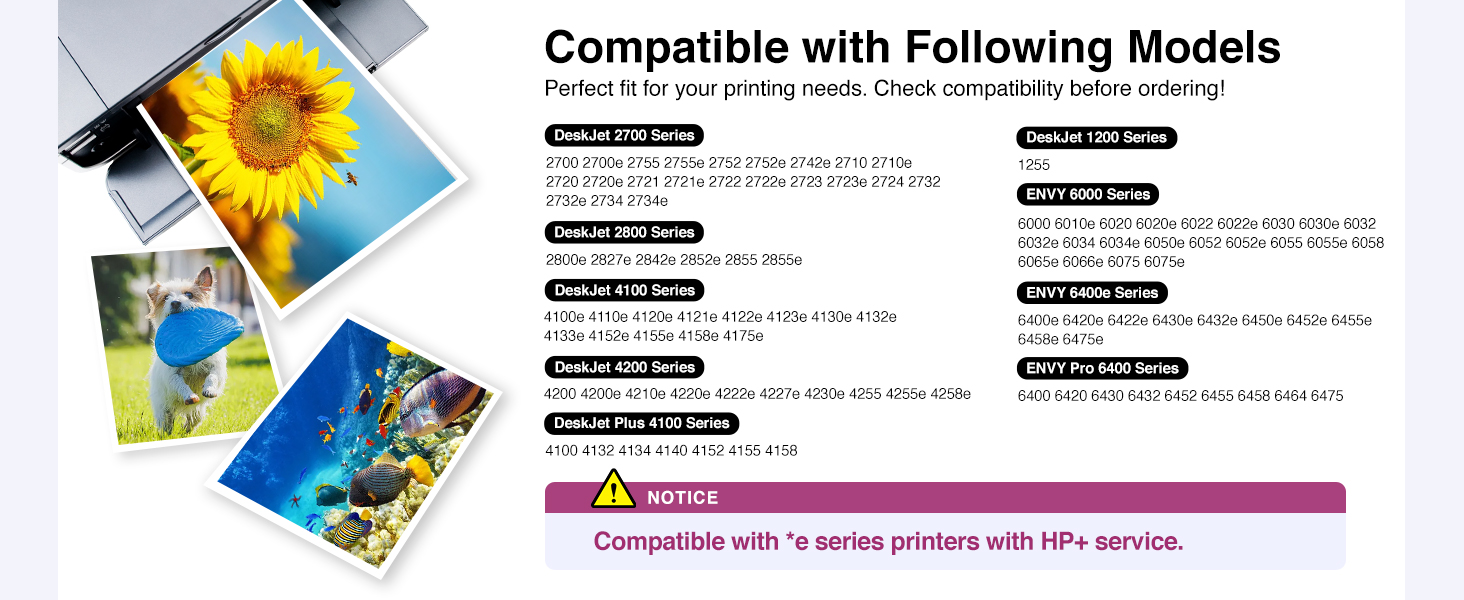 الموديلات المتوافقة: تعمل مع ENVY 6400e 6420e 6422e 6430e 6432e 6450e 6452e 6455e 6458e 6475e.ENVY Pro Series: 6400 6420 6430 6432 6452 6455 6458 6464 6475