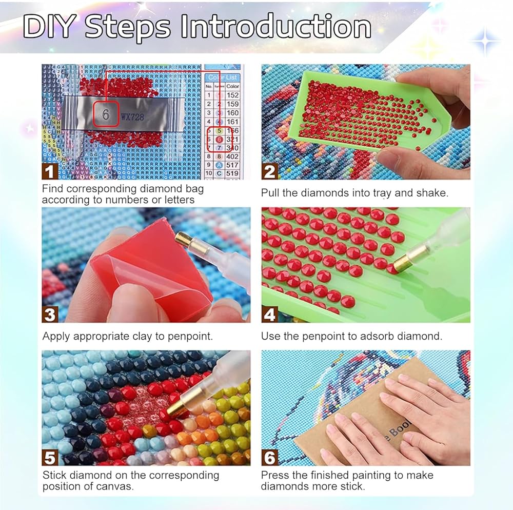 Package Includes: Diamond painting kits for adults contains: 1 pre-printed textured canvas (12x16 inches), 25 bags of diamond beads, 1 adhesive pen, 1 wax pad, and 1 plastic tray.