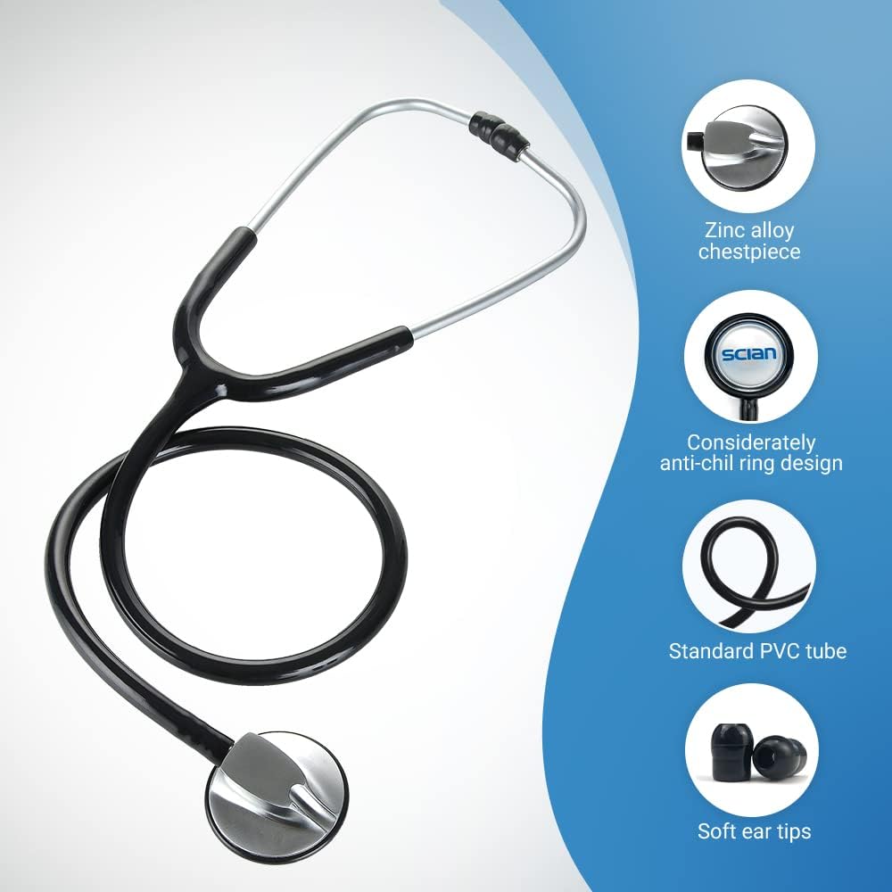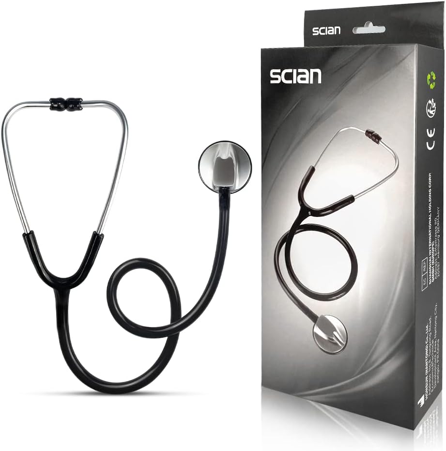 سماعة الطبيب SCIAN - طب القلب الكلاسيكي ذو الرأس الواحد للاستخدام الطبي والسريري، قطعة صدر فضية خفيفة الوزن مناسبة للممرضات والرجال والنساء والأطفال الرضع (أسود)