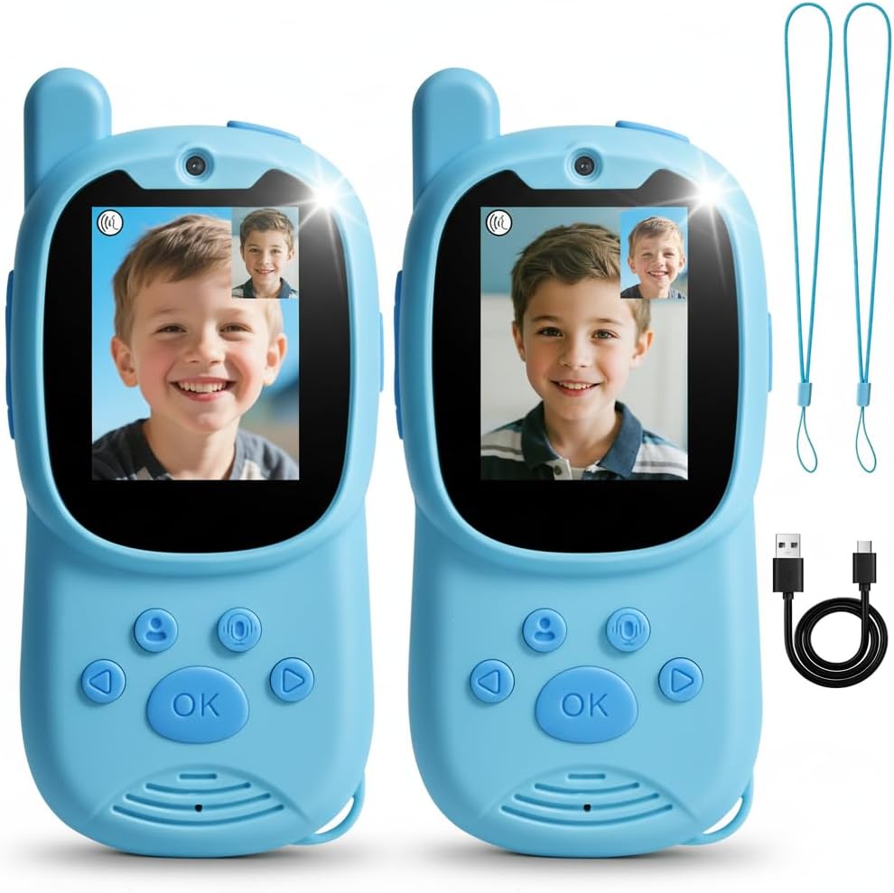 أجهزة اتصال لاسلكية للفيديو للأطفال، 2 حزمة من أجهزة الاتصال اللاسلكي للأطفال القابلة لإعادة الشحن يمكن إرسال رسالة، هدايا عيد الميلاد للأطفال من سن 3 إلى 12 عامًا، لعبة طفل صغير محمولة لعمر 4 5 6 7 8 9 سنوات (أزرق)