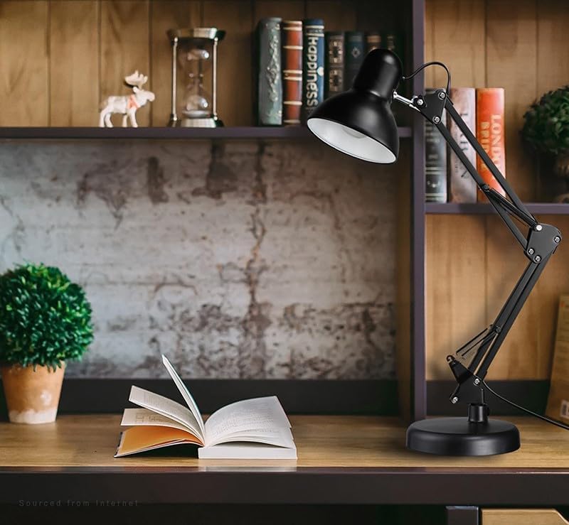 This adjustable clamp desk lamp is a versatile and reliable lighting solution for reading, studying, working, or crafting. With a multi-joint swing arm that extends up to 26 in (65 cm), a 360° rotating shade, and a strong metal clip base, you can easily direct light exactly where you need it. The articulated double-arm design (8.7 in + 8.7 in / 22 cm + 22 cm) provides excellent flexibility, making it ideal for home offices, dorm rooms, and studios. Compatible with E26 bulbs up to 60W (LED or incandescent), it features a 4.9 ft (1.5 m) power cord and a durable black matte finish. A sleek, space-saving solution to illuminate your workspace with style and efficiency.