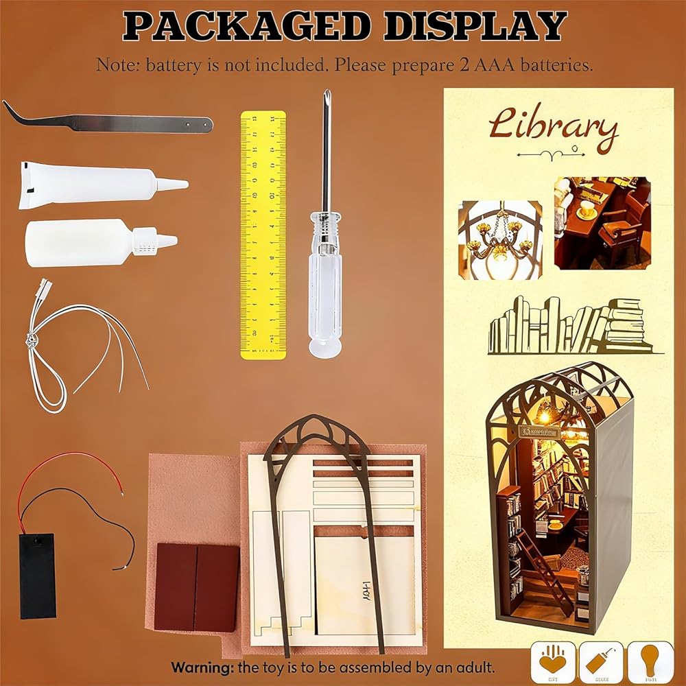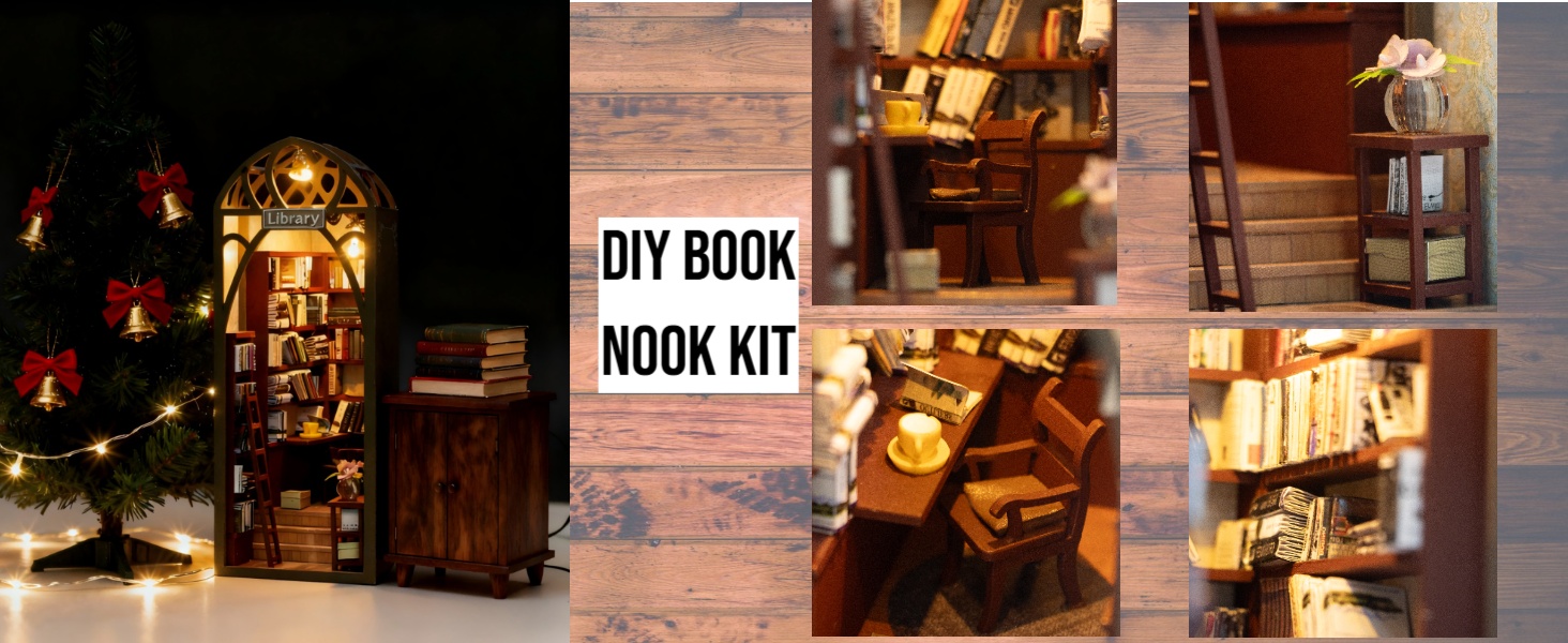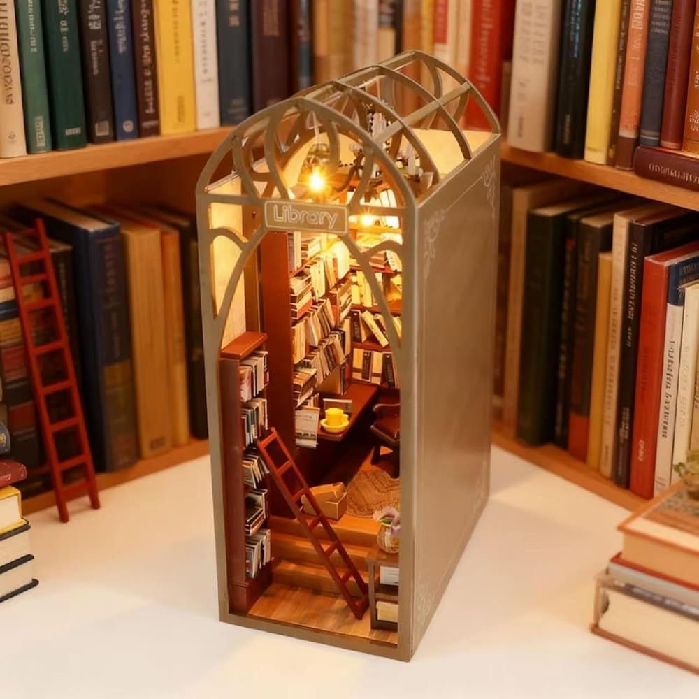 مجموعة زوايا الكتب التي يمكنك صنعها بنفسك مع مصابيح LED، وإدراج رف الكتب الخشبي ثلاثي الأبعاد وديكور بيت الدمى، ومجموعة بناء النماذج الإبداعية مع الأثاث للمكتب المنزلي، أو المكتبة، أو كدفاتر