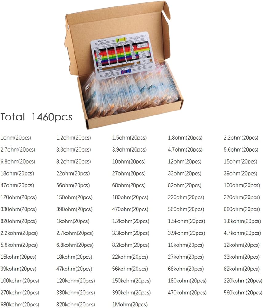 2.2 كيلو أوم (20 قطعة) 2.7 اوم (20 قطعة) 3.3 كيلو أوم (20 قطعة) 3.9 كيلو أوم (20 قطعة) 4.7 كيلو أوم (20 قطعة)