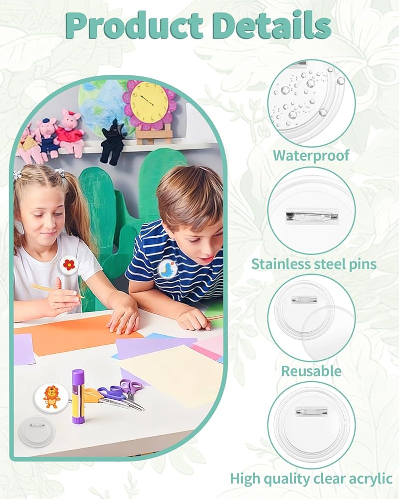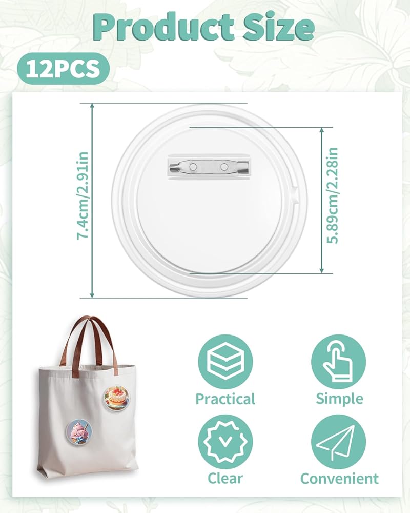 Package Included: You will receive 12 clear button pins, Button outer diameter is 74mm/2.91 inch and the applicable paper, photo, and picture size is 70mm/2.76 inch, These buttons pins can easily meet your personal DIY needs