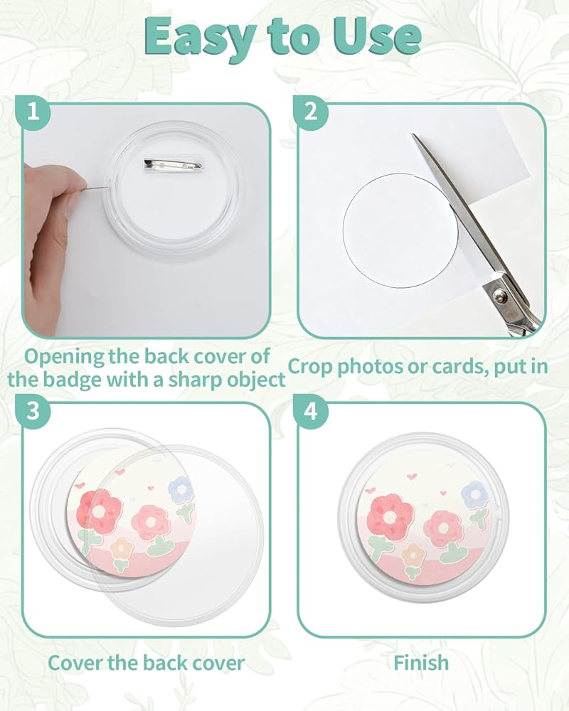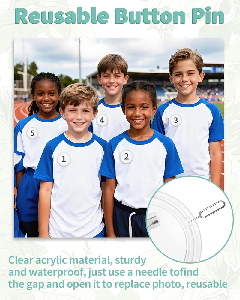Reusable: This custom buttons does not require assembly, simply place your picture or photo between two covers, press firmly until they close, and if you don't like it, simply insert the pin into the hole to replace the new photo. You can have a new badge anytime