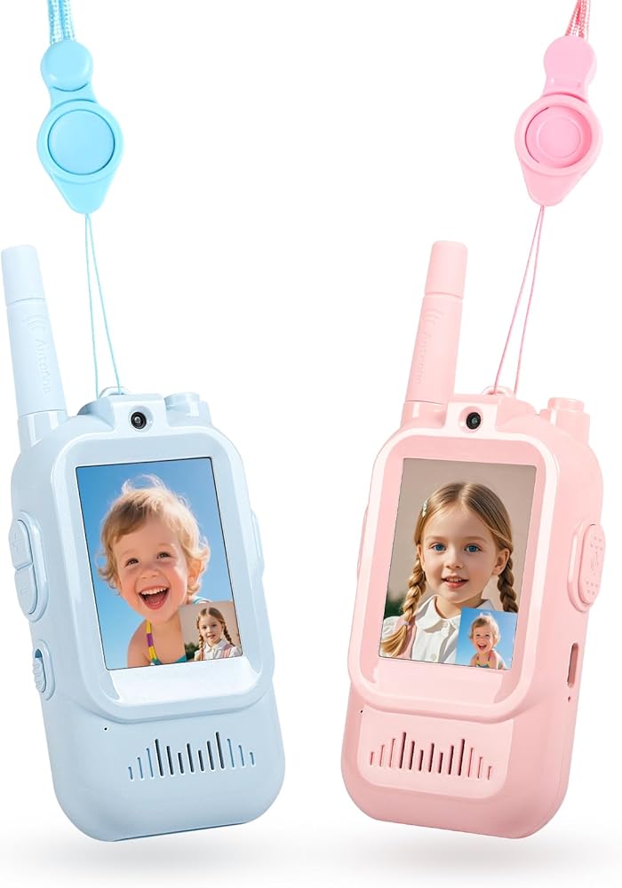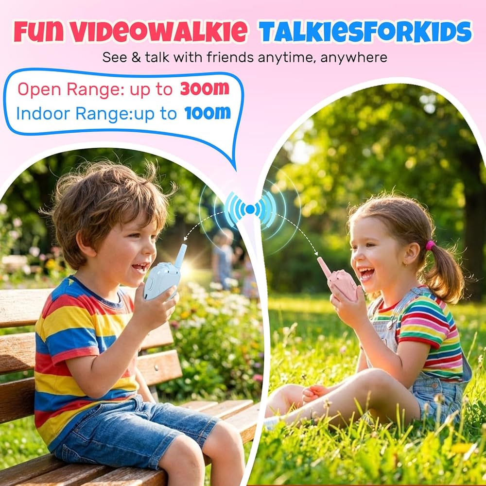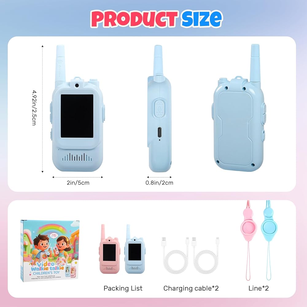 أجهزة اتصال فيديو لاسلكية للأطفال، عبوتان قابلة لإعادة الشحن، اتصال صوتي وفيديو طويل المدى، كاميرا عالية الدقة، تأثيرات صوتية ممتعة، مثالية للأولاد والبنات من سن 3 إلى 10 سنوات، لعب داخلي وخارجي - أزرق/وردي