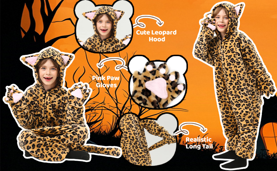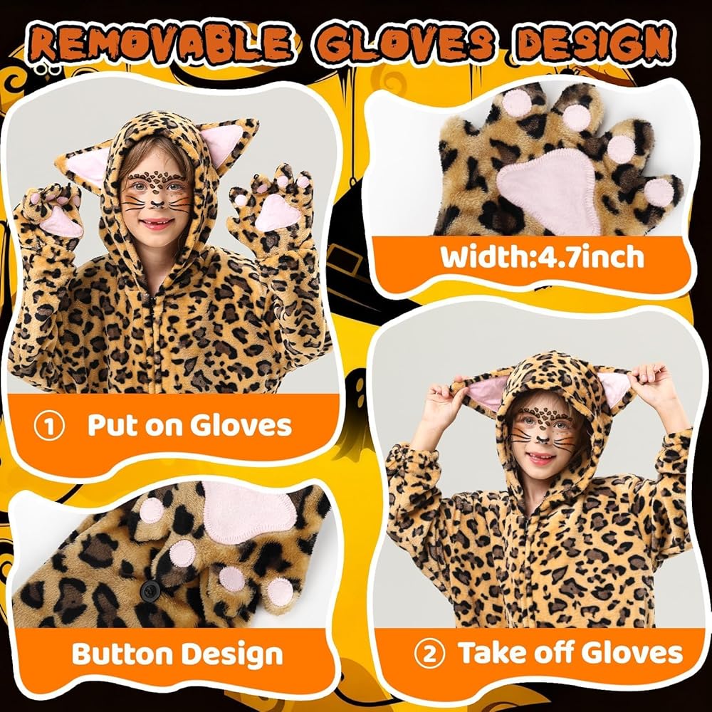 【تصميم الفهد الواقعي مع تفاصيل ممتعة】يتميز هذا الزي بغطاء رأس مرح بطبعة الفهد مع آذان مرحة وذيل ثابت وقفازات مخالب قابلة للفصل، مما يجلب مغامرة خيالية إلى الحياة. التصميم المعقد يجعله زي الفهد المميز الذي يعشقه الأطفال في الهالوين أو المناسبات التنكرية.