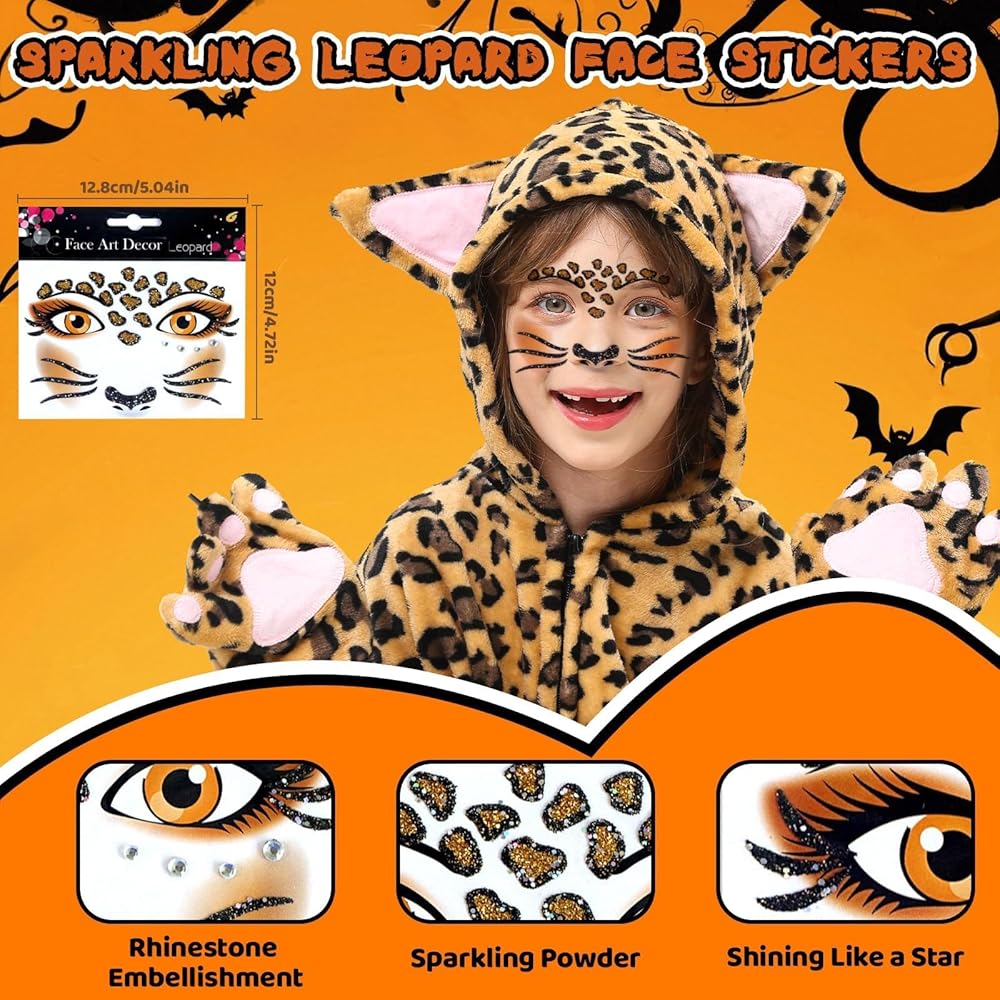 【ملصقات فنية للوجه متلألئة لمزيد من المرح】تتضمن ملصقات فنية للوجه مبهرة وقابلة لإعادة الاستخدام ومزينة بأحجار كريمة أكريليك ورقائق لامعة. مثالية لإكمال زي القطط أو زي الفتيات الفهد في الحفلات أو جلسات التصوير أو المناسبات التنكرية، لا حاجة للمكياج، مما يعزز اللعب الإبداعي.