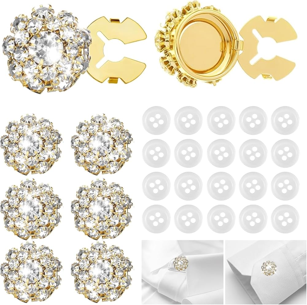 26-Piece Set: Includes 6 clip-on Shiny Rhinestone button cover (2 cm) and 20 sewing buttons to customize blouses, suits, tuxedos, and shirts with stylish elegance.