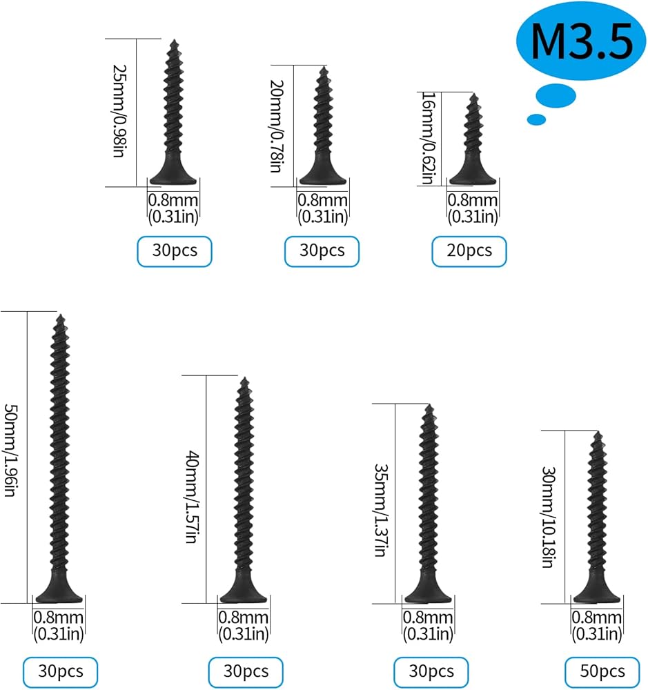 تشمل العبوة: سوف تحصل على ما مجموعه 220 قطعة من البراغي الخشبية بأحجام مختلفة، بما في ذلك M3.5 (16 مم / 20 مم / 25 مم / 30 مم / 35 مم / 40 مم / 50 مم)، كافية للاستخدام اليومي.