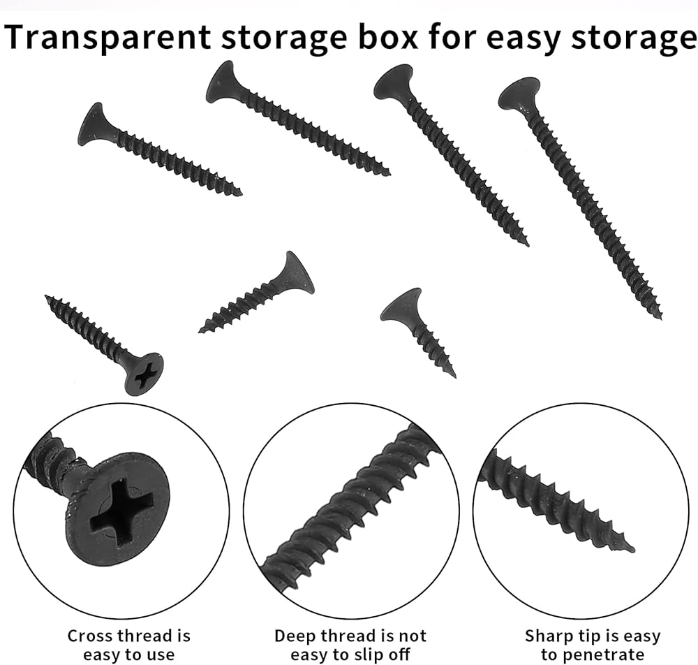 - جميع براغي الحائط الجافة السوداء معبأة في صندوق بلاستيكي سهل الاستخدام والبحث والحمل.