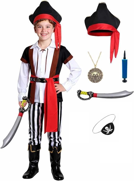 • Extensive Accessories: Comes with a Long sleeved shirt, connected to the vest, a pirate hat, eye patch, gold medallion necklace, inflatable sword with pump, pirate stickers, gold coins, and a treasure pouch for a full pirate experience.