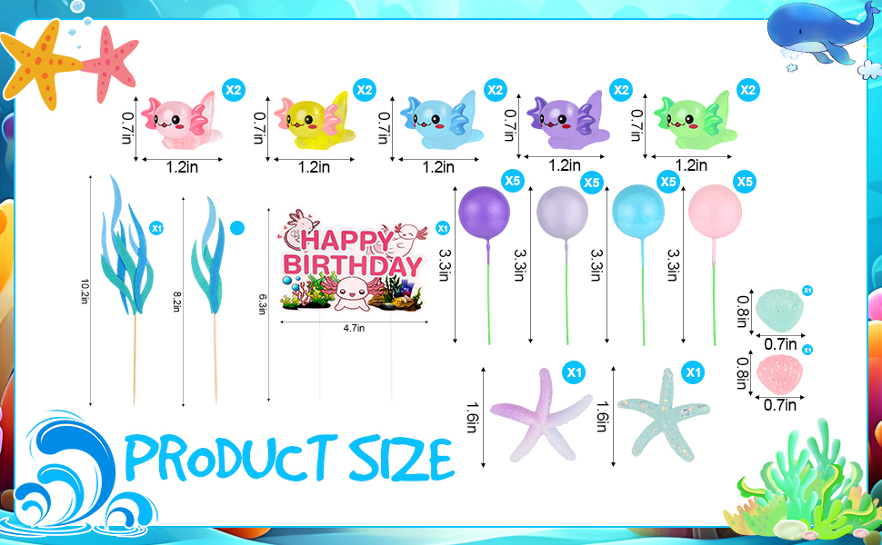 زينة كعكة عيد ميلاد أكسولوتل: تحتوي هذه المجموعة المكونة من 37 قطعة على قطعة علوية كبيرة لكعكة أكسولوتل، و2 نجم بحر، و2 صدفة، و10 أشكال أكسولوتل صغيرة، و20 كرة لؤلؤية، و2 من الأعشاب البحرية اللباد. مثالية لعمل حلويات أو زينة للكيك مستوحاة من أكسولوتل.