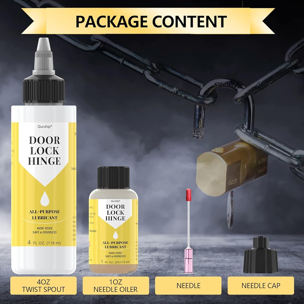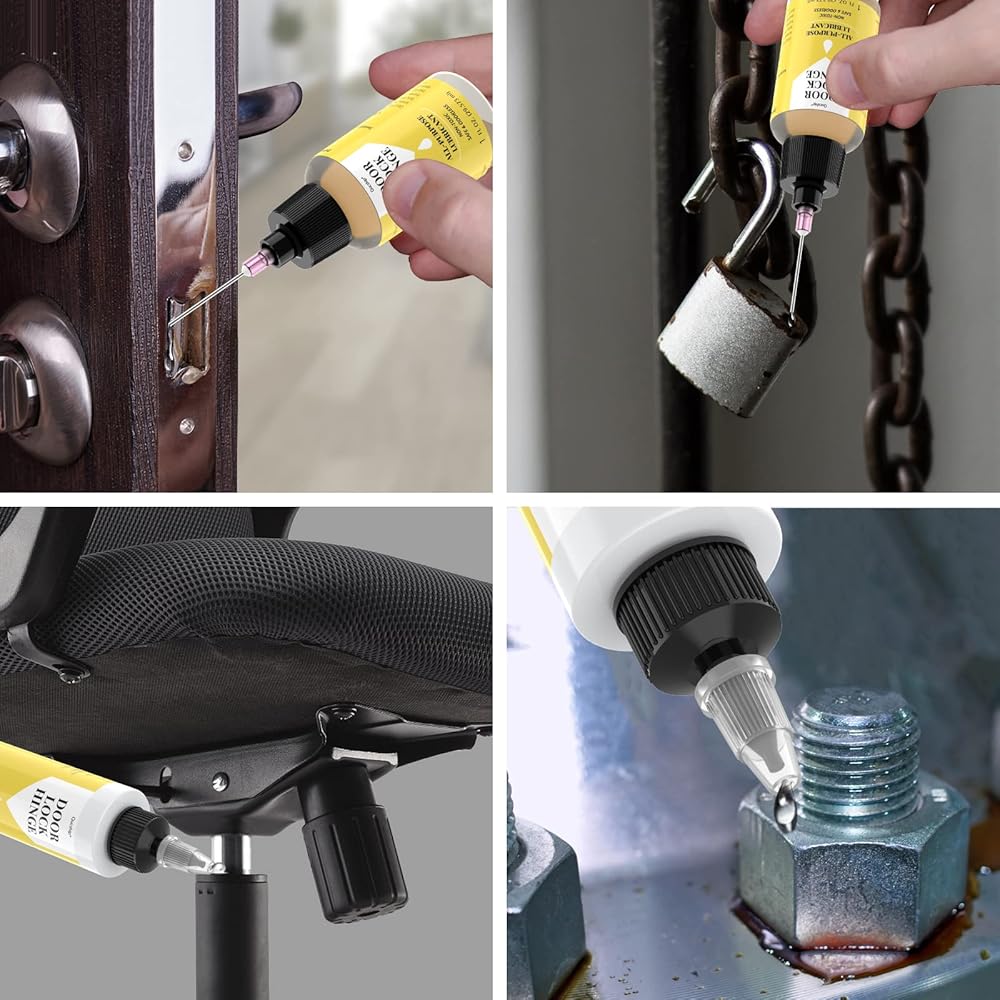 فعال على الفور ويدوم طويلاً؛ يعمل مباشرة بعد وضع بضع قطرات من زيت تشحيم مفصلات الباب، وتختفي الصرير ويدوم لفترة طويلة ويحافظ على مظهر الأبواب والأقفال والمفصلات بشكل جيد ويعمل بشكل صحيح لفترة طويلة. لا مزيد من الأبواب المنزلقة القوية أو الأقفال العالقة أو الأبواب التي تصدر صريرًا.