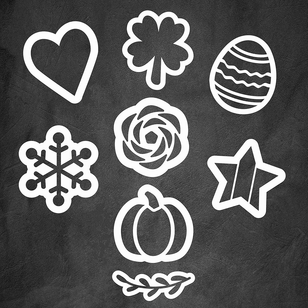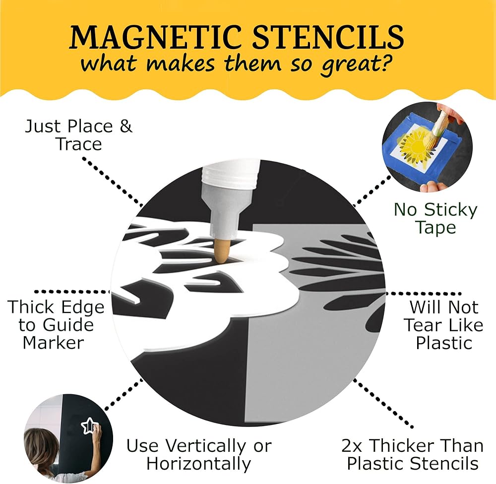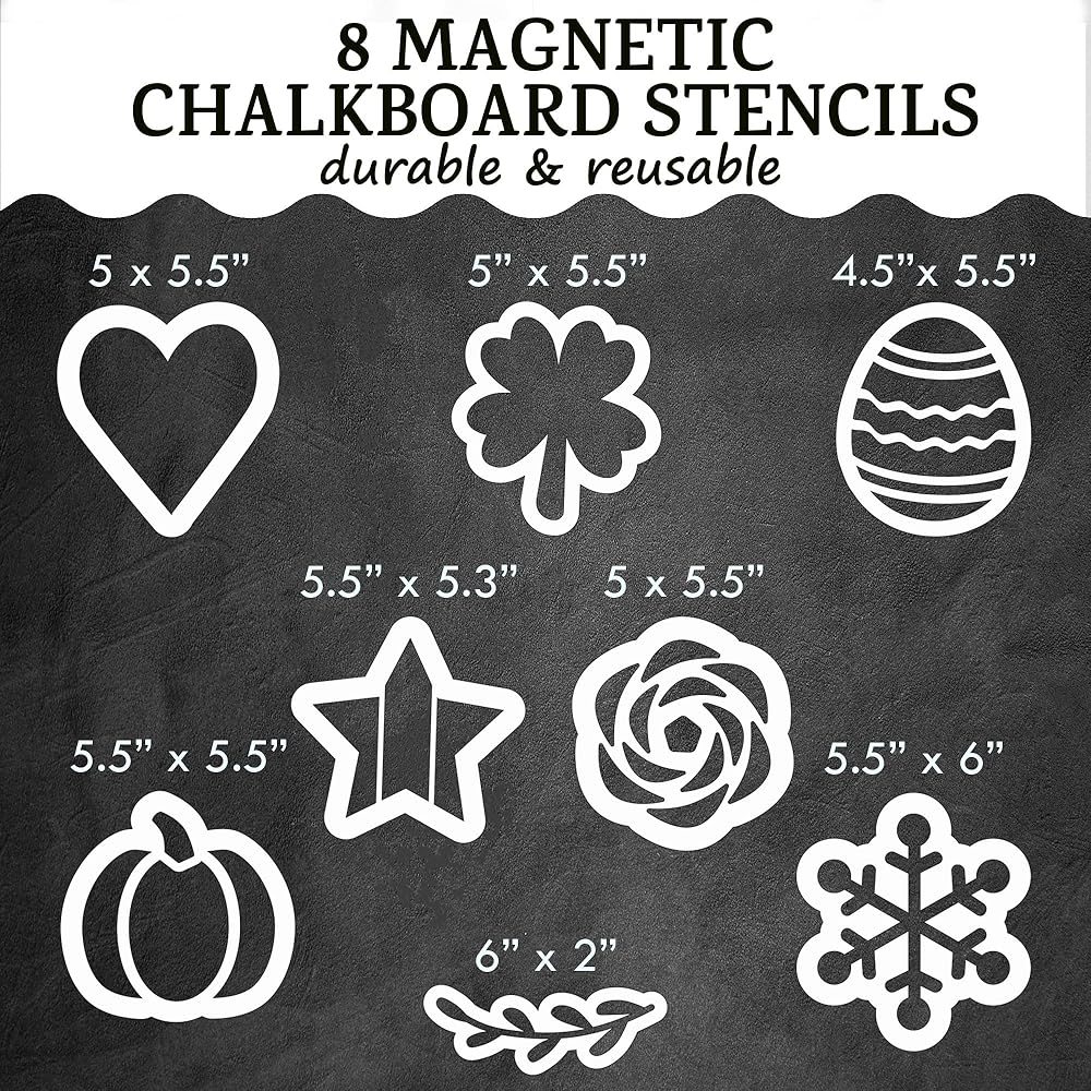 اصنع بسهولة فن الطباشير المذهل للعطلات باستخدام الاستنسلات المغناطيسية! ما عليك سوى وضعها على السبورة المغناطيسية أو السبورة البيضاء أو السطح المعدني وتتبعها باستخدام أقلام الطباشير لصناعة ديكور العطلات الخاص بك بنفسك.