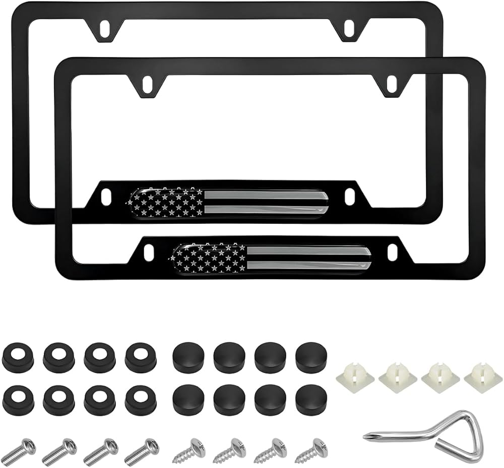 قطعتان من إطارات لوحة ترخيص السيارة، أغطية لوحة ترخيص وطنية من سبائك الألومنيوم بالعلم الأمريكي، حامل لوحة ترخيص عالمي مقاوم للصدأ بعلم الولايات المتحدة لعلامات السيارة الأمامية والخلفية (أسود)