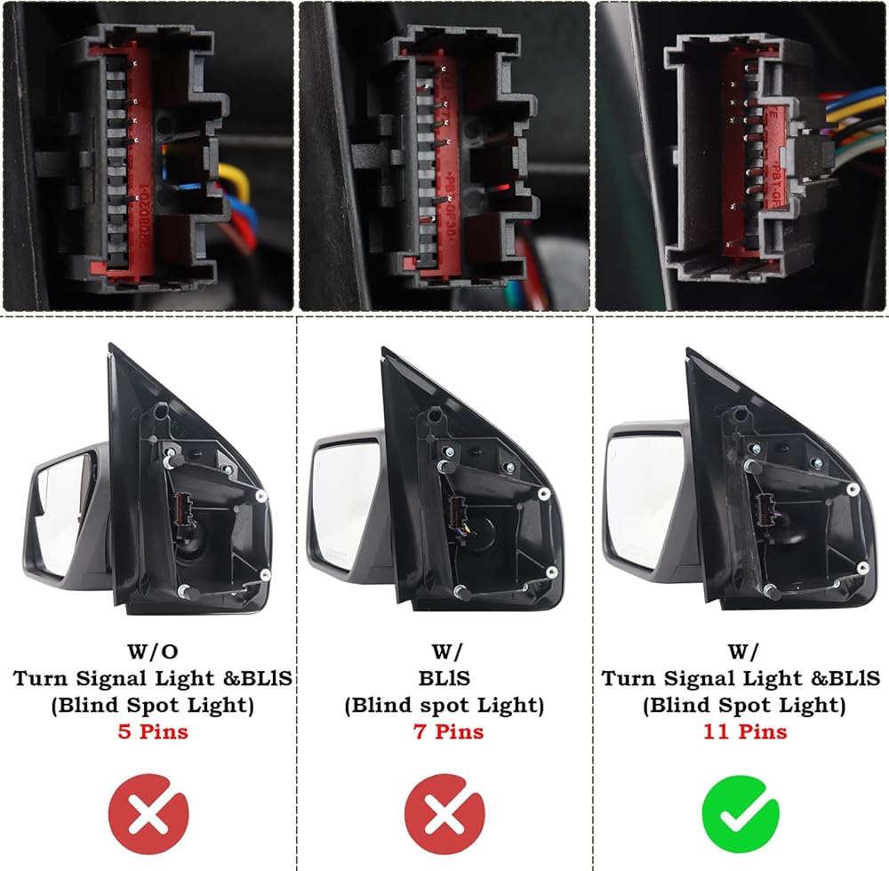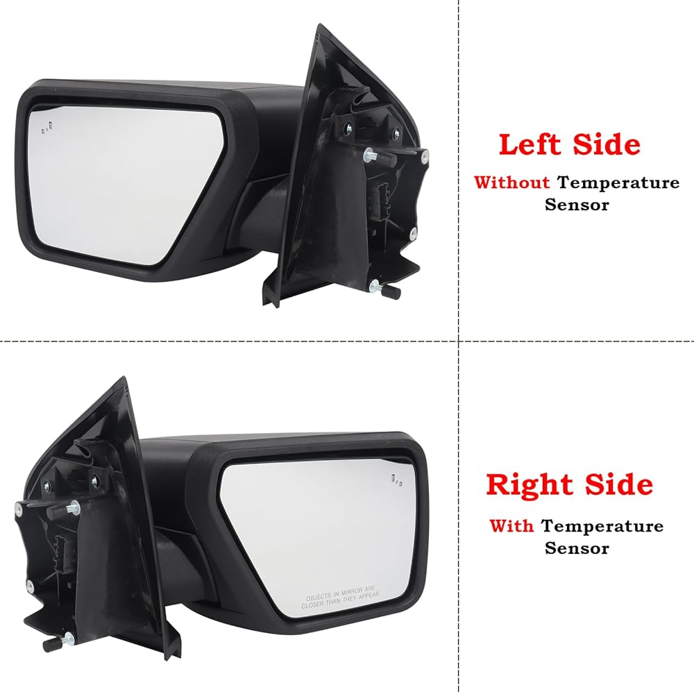 ملاحظة مهمة: لا تحتوي مرآة الجانب الأيسر للسائق على جهاز استشعار لدرجة الحرارة، فقط مرآة الجانب الأيمن للراكب هي التي تحتوي على ذلك. بالإضافة إلى ذلك، لا يأتي هذا المنتج مع ضوء إشارة الانعطاف وBLIS (ضوء النقطة العمياء)، يرجى التحقق من التفاصيل لاختيار المنتج المناسب