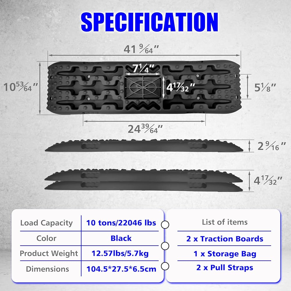 • 【أداء ممتاز】: ألواح الجر مقاس 41 بوصة مصنوعة من مادة البولي بروبيلين عالية القوة، وتزن 5.2 كجم لكل زوج، وهي خفيفة الوزن ولكن يمكنها تحمل ما يصل إلى 10 أطنان من الوزن، وتتميز بمتانة ممتازة ومرونة ومقاومة للحرارة والتآكل، ويمكن ثنيها حتى 120 درجة دون أن تنكسر أو تشوه.