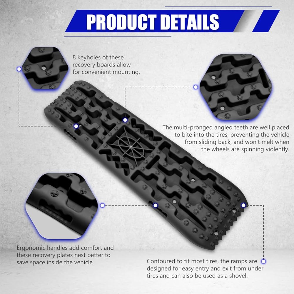 • 【تصميم محمول وسهل الاستخدام】: أربعة مقابض مريحة على جانبي لوحة الطرق الوعرة تضمن لك قبضة آمنة مع ضغط وتعب أقل على يديك أثناء مغامراتك. يمكن استخدام الطرف ذو الشكل المجرف كمجرفة مؤقتة لإزالة الرمل أو الثلج من إطاراتك بسهولة. 10 فتحات قفل تجعل من السهل تركيب ألواح الجر على رفوف السقف المتوفرة لسهولة النقل