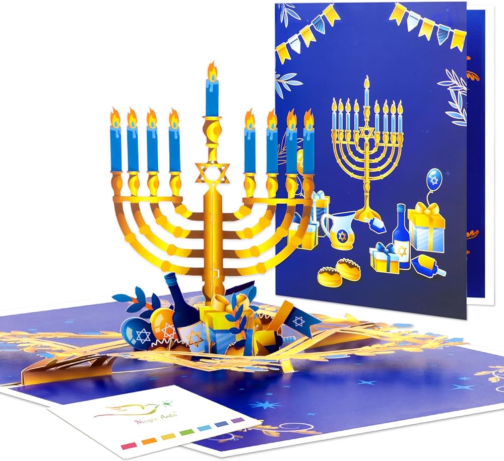 - 🕎 𝐄𝐧𝐜𝐡𝐚𝐧𝐭𝐢𝐧𝐠 3𝐃 𝐏𝐨𝐩-𝐔𝐩 𝐃𝐞𝐬𝐢𝐠𝐧 – يتميز بشمعدان ثلاثي الأبعاد مذهل مع تسع شموع وامضة، محاطًا بالدريدل وصناديق الهدايا ورموز هانوكا التقليدية. يضفي الحيوية على مهرجان الأضواء للاستمتاع بتجربة عطلة سحرية.