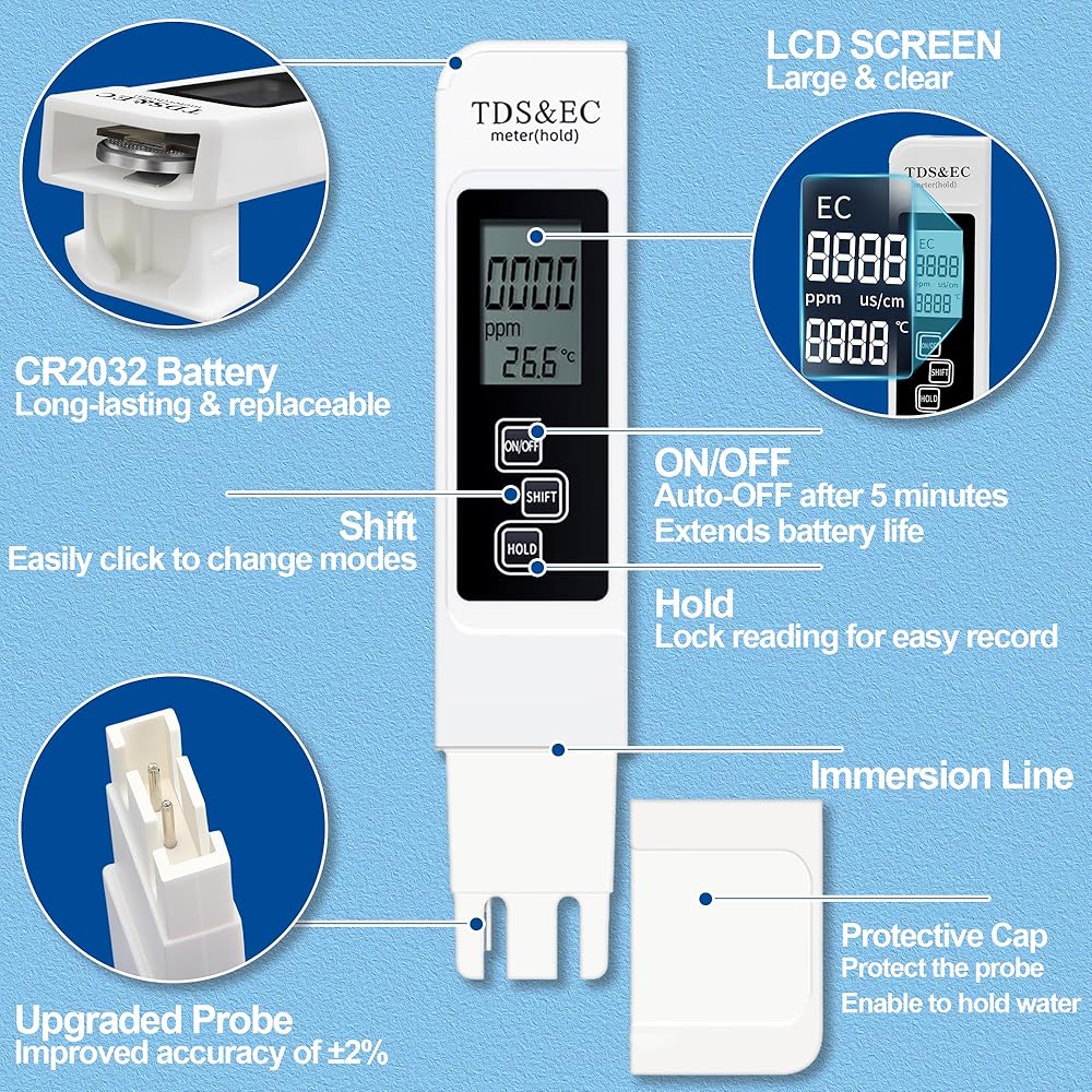جهاز قياس TDS 3 في 1 - مع وظيفة 3 في 1، يمكن لجهاز قياس TDS الخاص بنا اختبار TDS وEC (الموصلية الكهربائية) ودرجة الحرارة لتلبية احتياجاتك من 3 قياسات مختلفة. لم تكن مريحة لك فحسب، بل توفر أيضًا وقتك وأموالك، وهي بالتأكيد مجموعة مفيدة لحياتك.