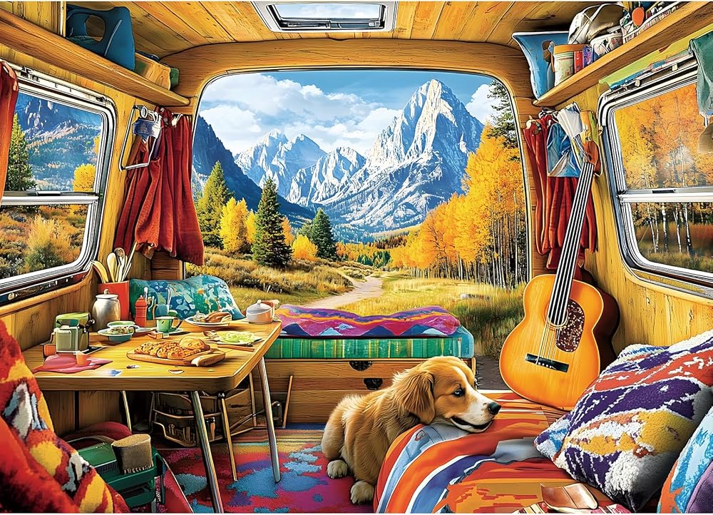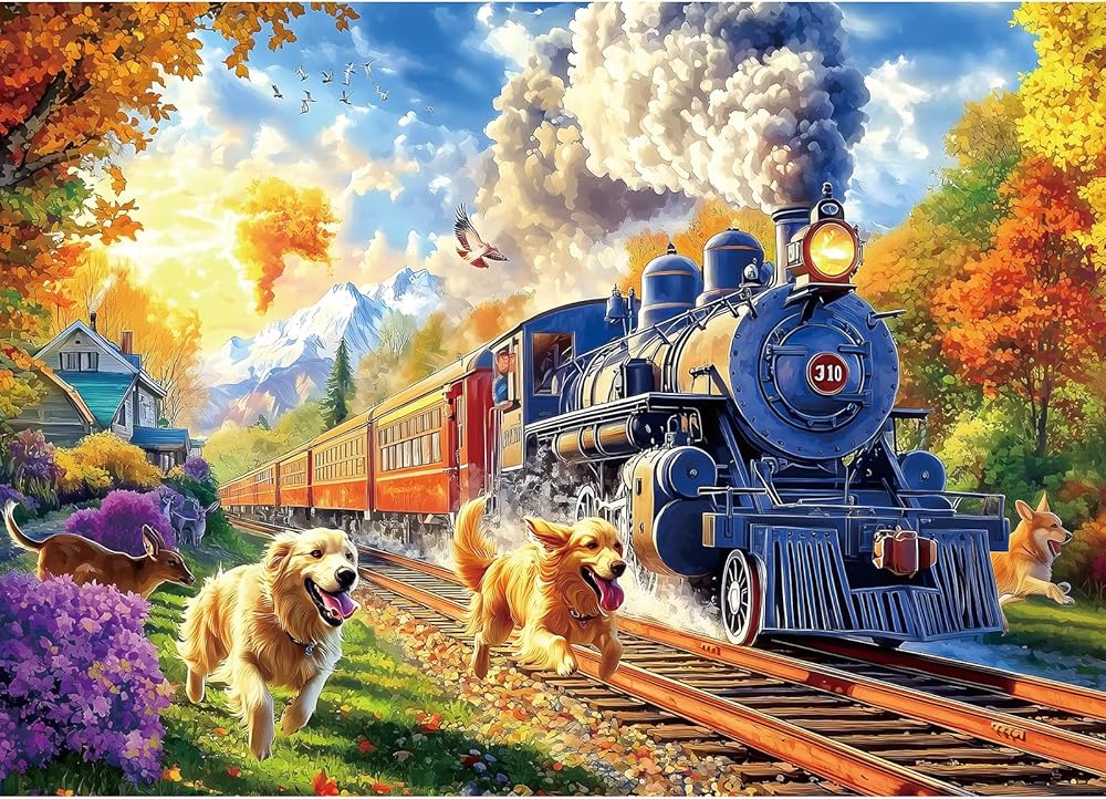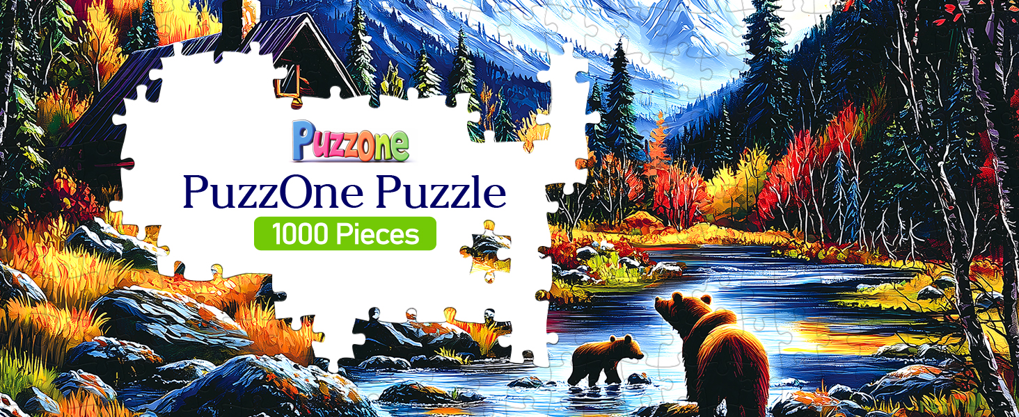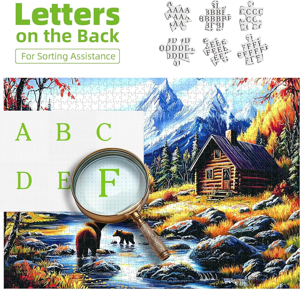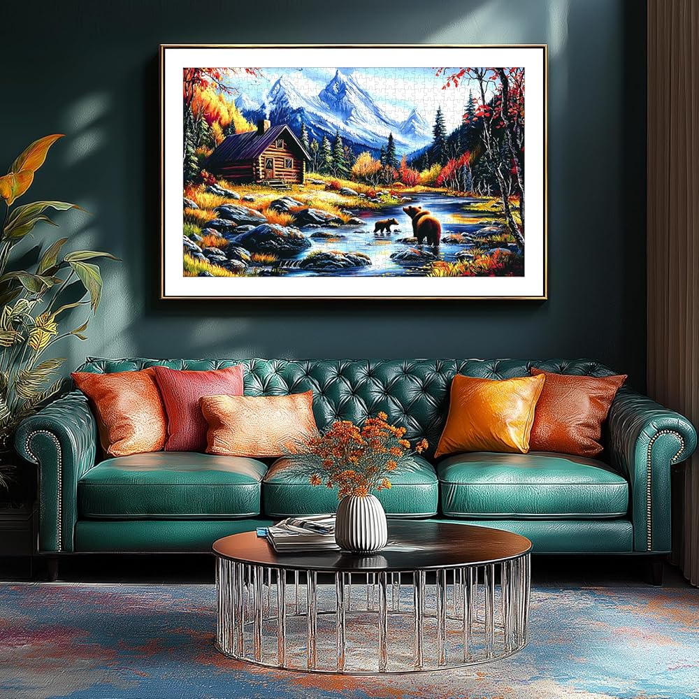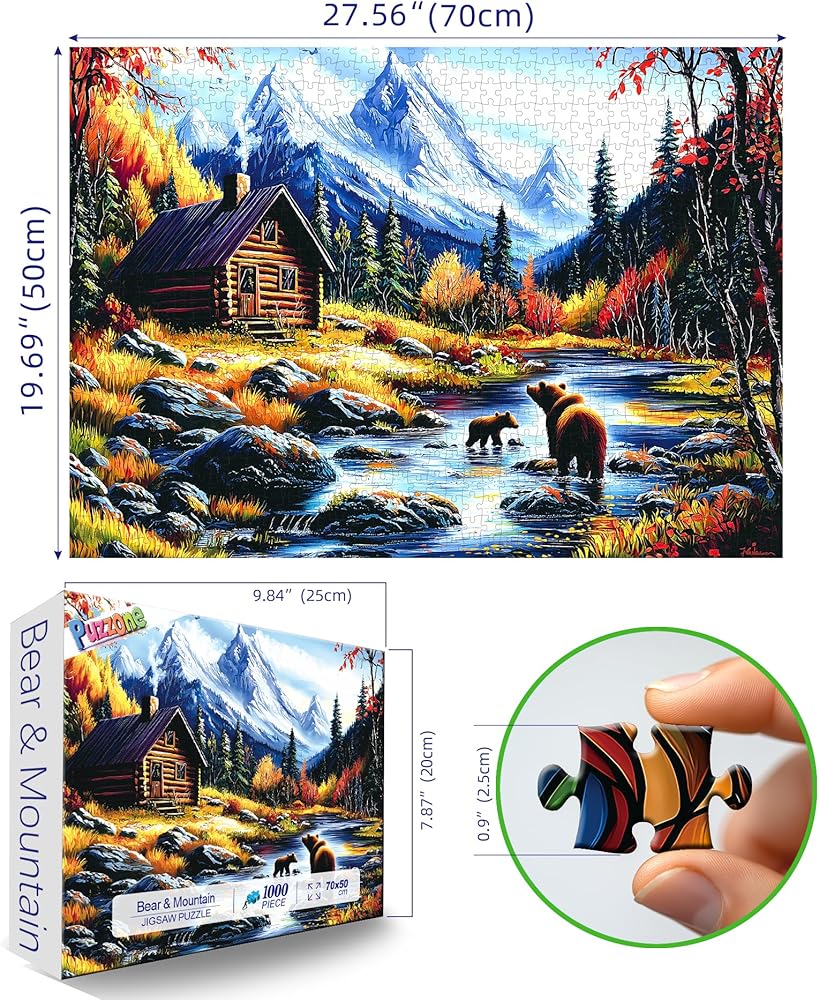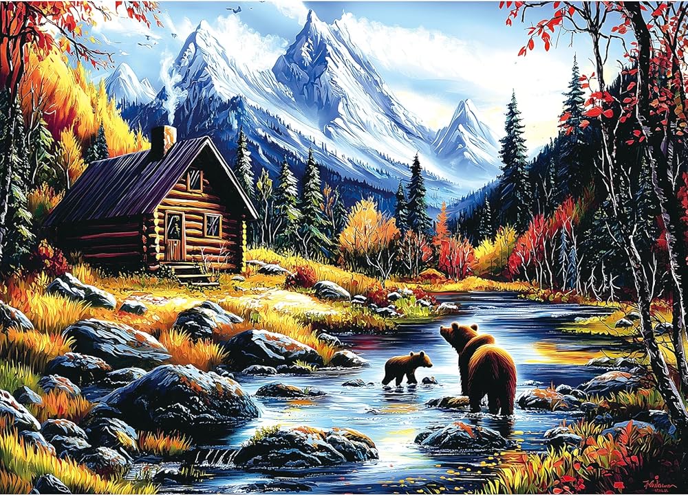 🏔مناظر جبلية مهيبة: هذه الأحجية المكونة من 1000 قطعة تلتقط مناظر طبيعية خريفية مذهلة، وتتميز بدببة بنية مرحة في جدول كريستالي، ومقصورة خشبية ريفية، وجبال مهيبة مغطاة بالثلوج تحت سماء زرقاء صافية، مثالية لمحبي الطبيعة.
