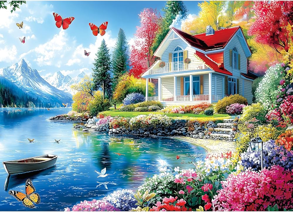 1000 قطعة من ألغاز الصور المقطوعة للبالغين، مقصورة على ضفاف البحيرة مع ألغاز نار للبالغين، هدية ألغاز صعبة مستحيلة لمحبي ألغاز الصور المقطوعة البالغين (27.5 بوصة × 19.7 بوصة)