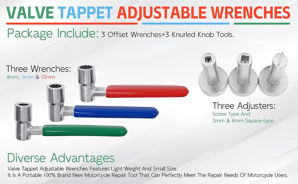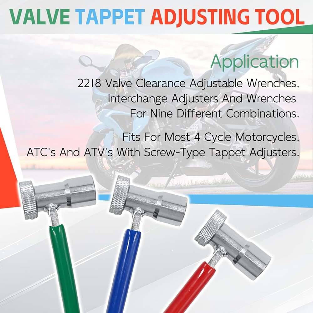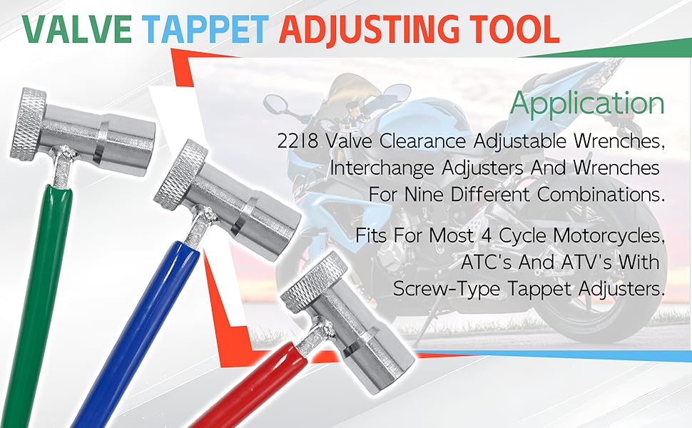 التطبيق: 2218 مفتاح ربط قابل للتعديل لخلوص الصمام، وأدوات ضبط التبادل ومفاتيح الربط لتسعة مجموعات مختلفة تناسب معظم الدراجات النارية ذات الأربع دورات، وATC's وATV مع أدوات ضبط الغماز من النوع اللولبي