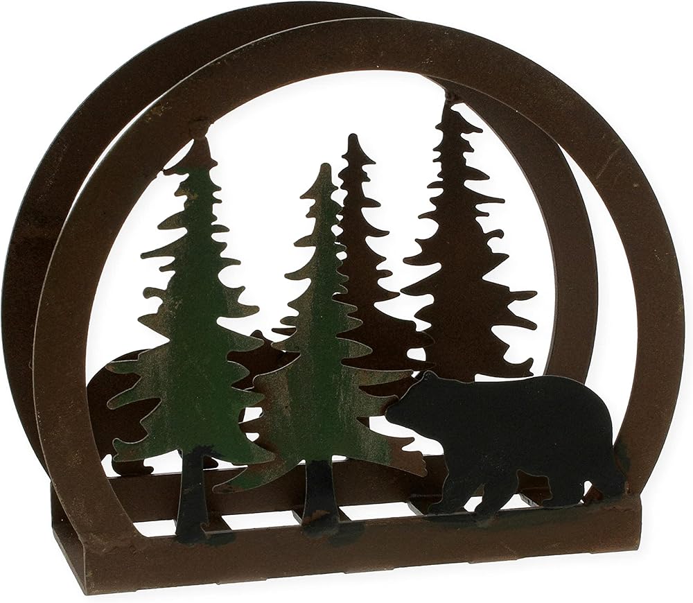 Keep your napkins in place in style with this novelty napkin holder. Featuring a black bear and an evergreen tree theme, this metal napkin holder adds a stylish rustic touch to your dining room table or kitchen countertop. Measures 6"L x 5"H x 2.5"D.