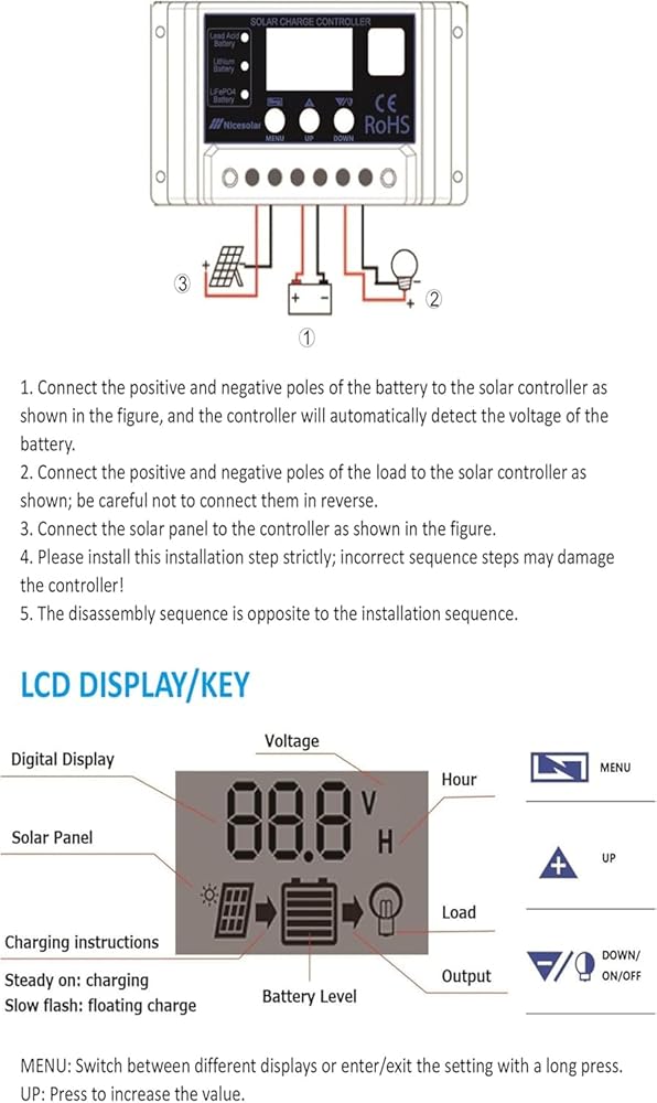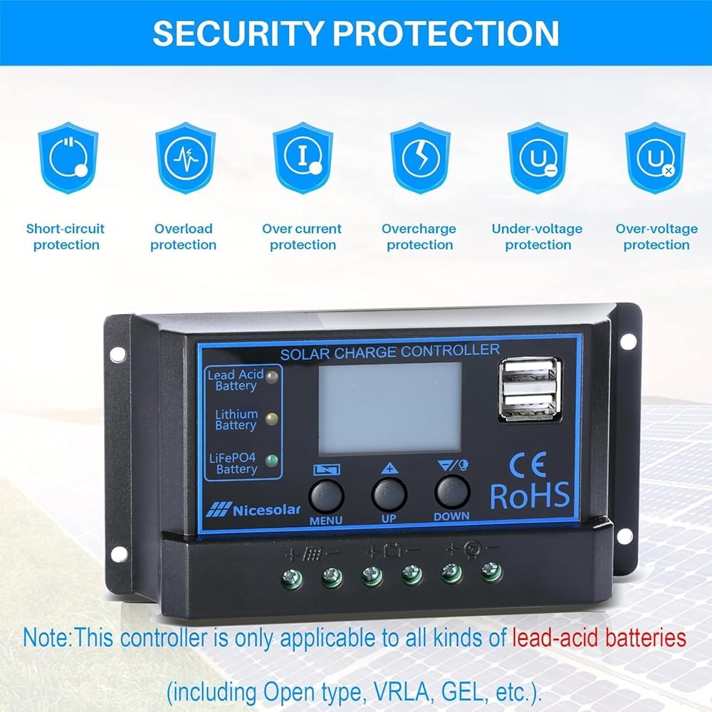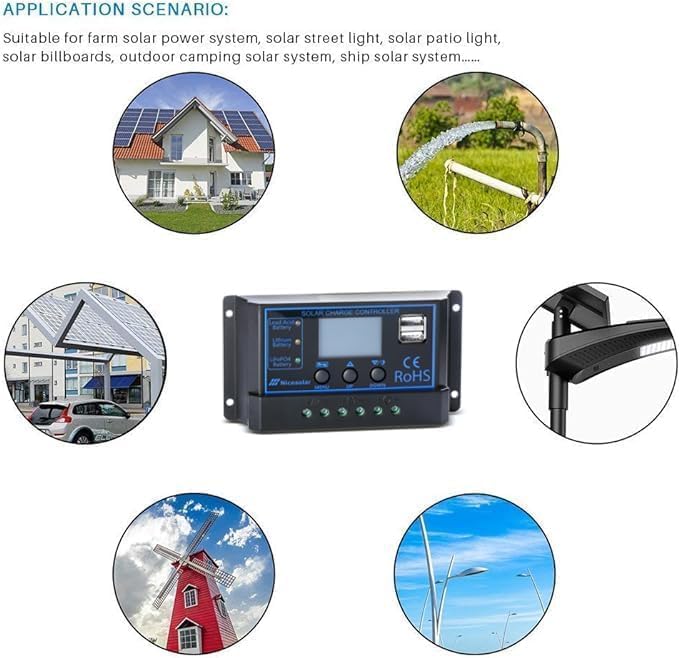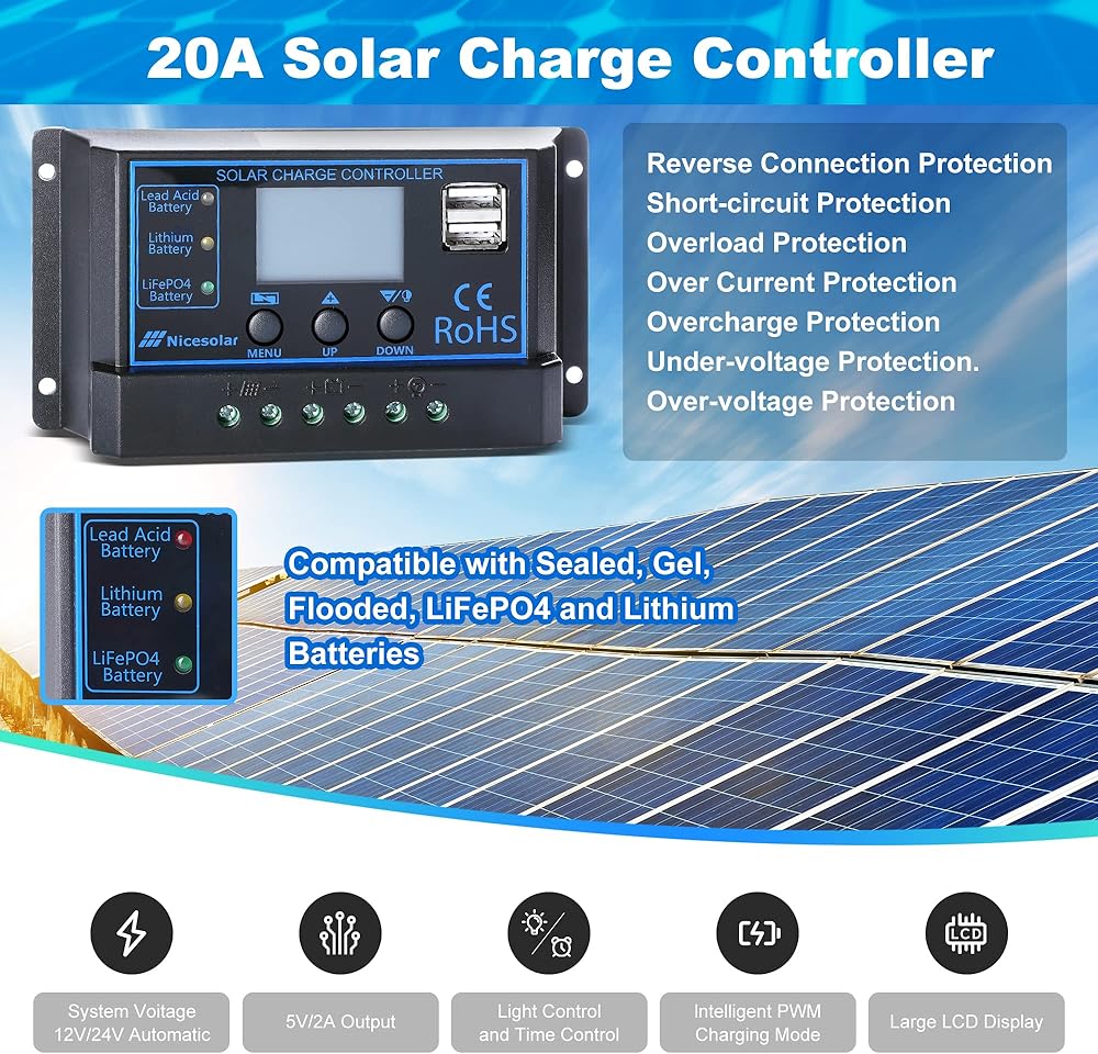 Nicesolar 20A 12V 24V جهاز التحكم بالشحن الشمسي PWM منظم لنظام مجموعة الألواح الشمسية AGM جل حمض الرصاص المختوم وبطارية الليثيوم، LiFePO4 بطارية ليثيوم أيون فوسفات ذات دورة عميقة