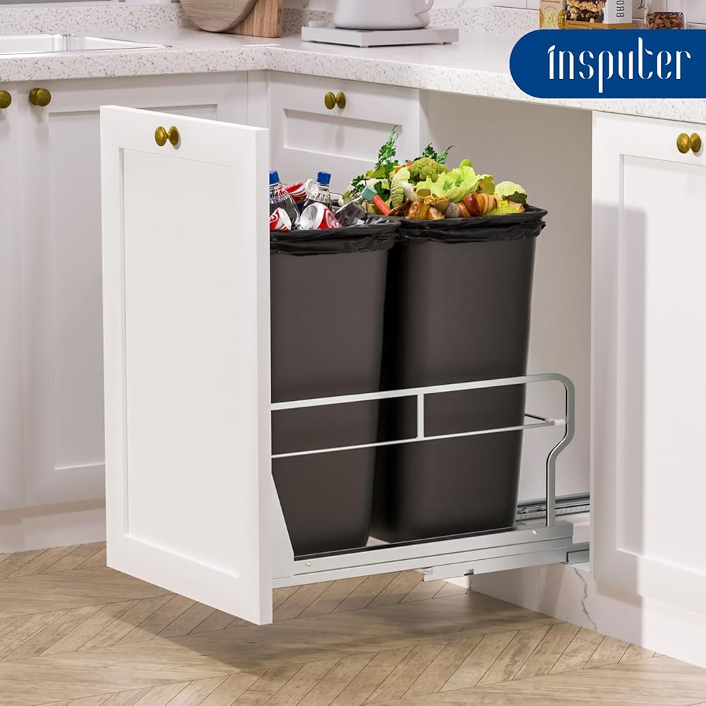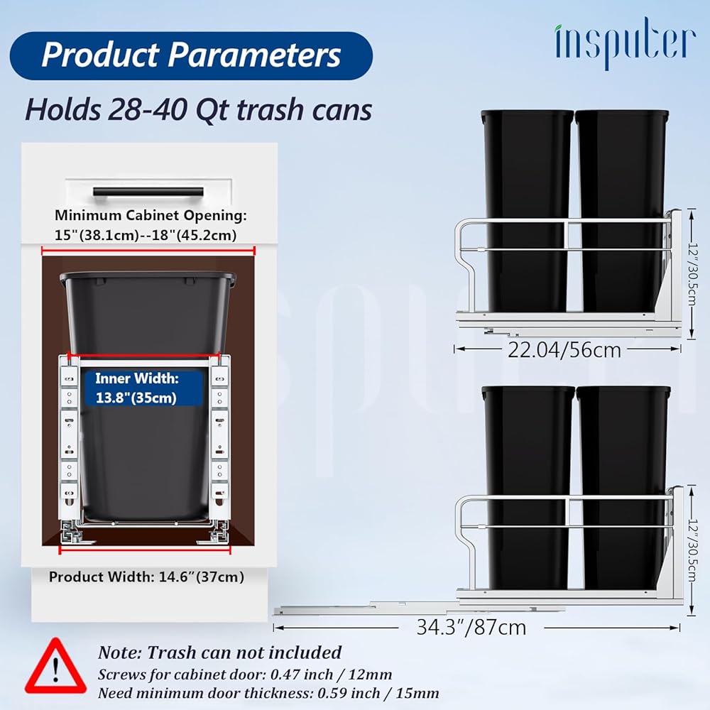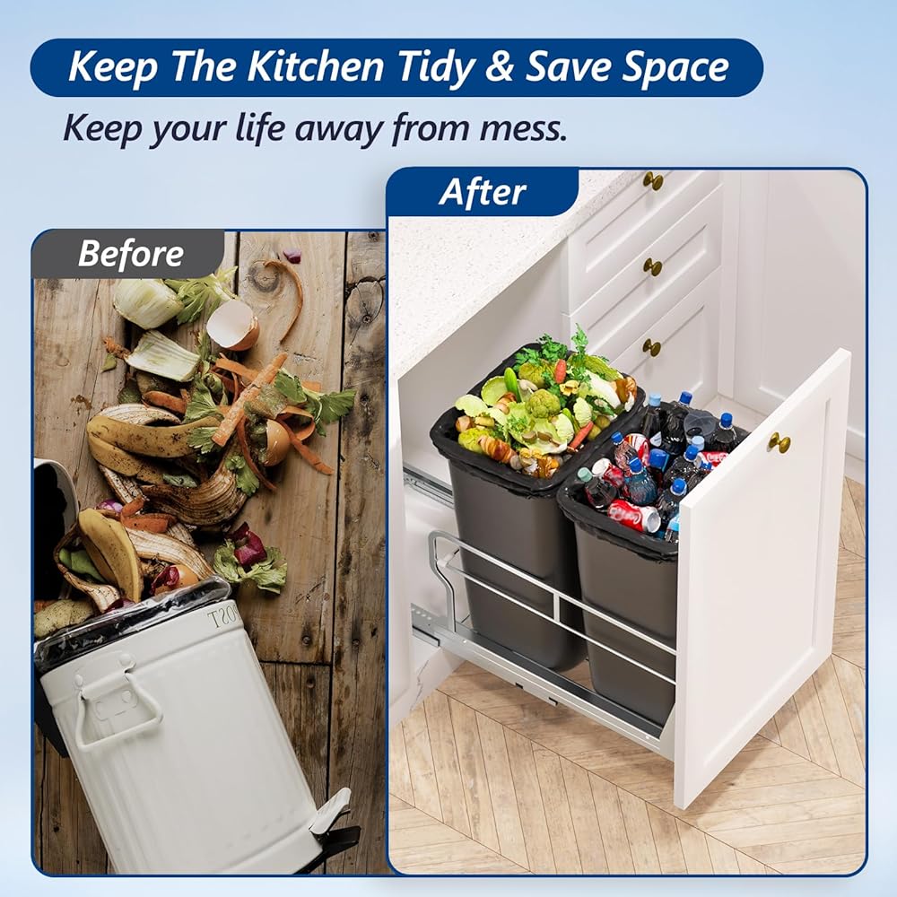 سلة المهملات المزدوجة القابلة للسحب: مجموعة سلة المهملات القابلة للسحب وصندوق إعادة التدوير! يمكن أن تحتوي سلة المهملات الموجودة أسفل الحوض على سلتين بسعة 35 لترًا للمساعدة في التخلص من مخاوف فرز القمامة والحفاظ على مطبخك نظيفًا ومرتبًا. تعتبر سلة المهملات المزدوجة الموجودة أسفل الحوض قابلة للسحب للخارج مثالية لاحتياجات منزلك وعملك. ملحوظة: سلة المهملات غير متضمنة.
