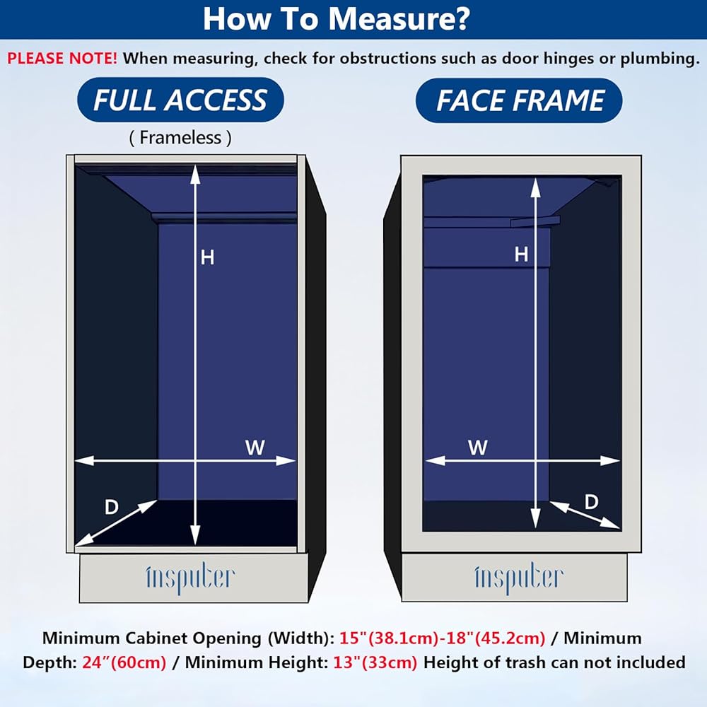 يمكن أن تتطلب القمامة المزدوجة التي يمكن أن تُقمصها تحت الخزانة مع شرائح ناعمة ، والخدمة الشديدة تحت الحوض في حوض المطبخ ، والغسيل ، والقمامة لا يمكن تضمينها ، وتتطلب 17 "W × 24" خزانات د