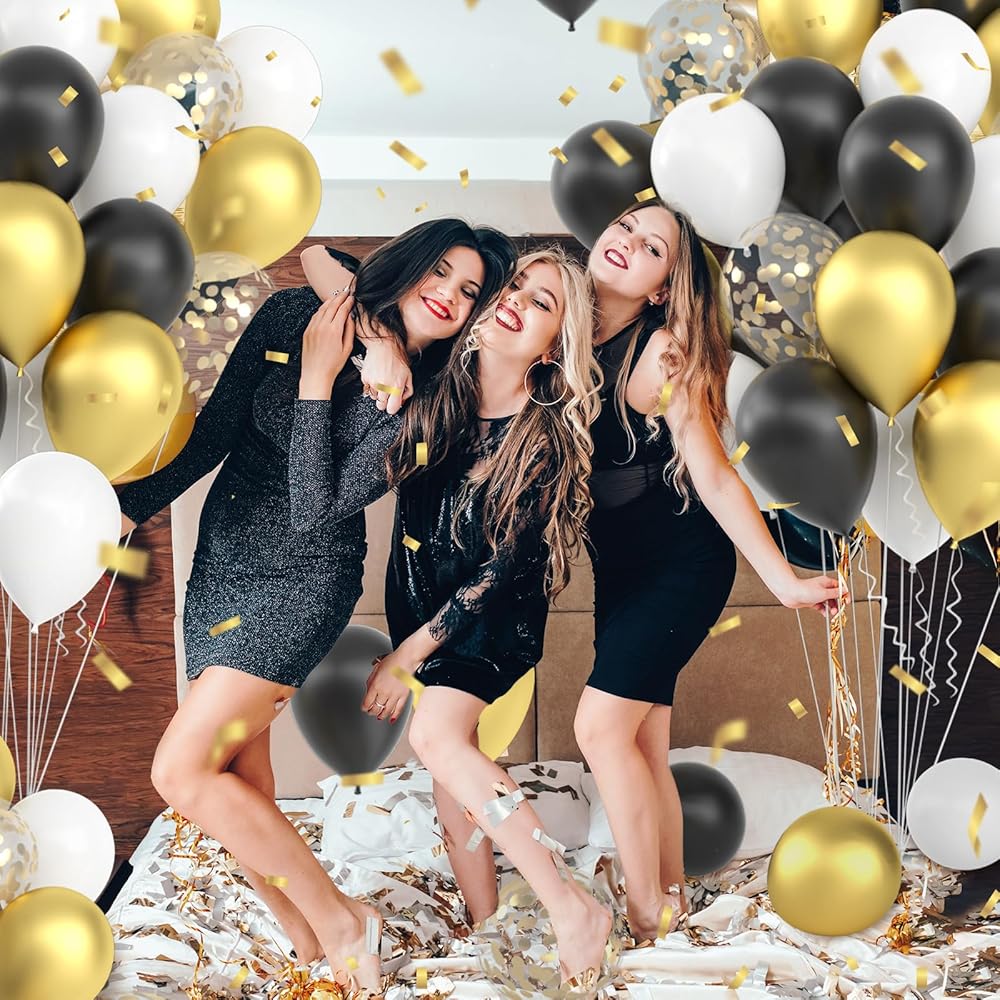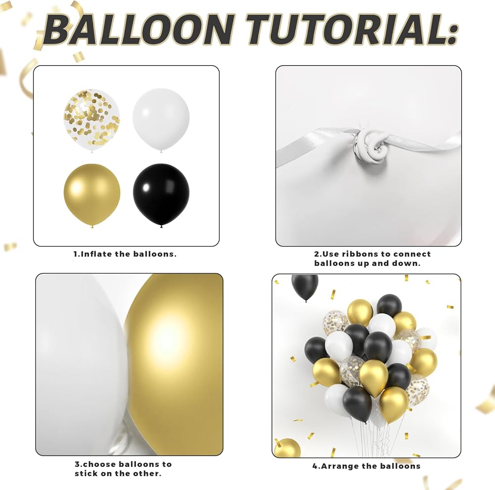 Set Contains: Black and gold balloons set include 64pcs assorted party balloons of 12 inches 4 colors(Metallic gold, matte white, matte black, gold confetti) ,2pcs glue dots and 2pcs ribbon (33 feet total).