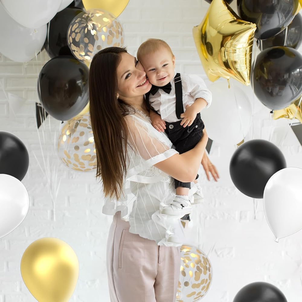 Premium Material: These black white gold balloons are made of latex which is thicker non-toxic, tasteless, long-lasting, reusable, safe to use around children.
