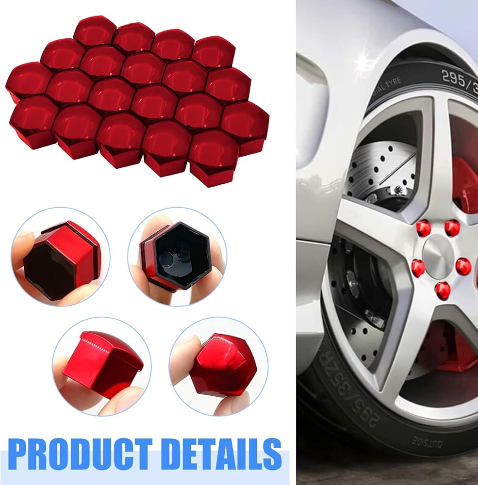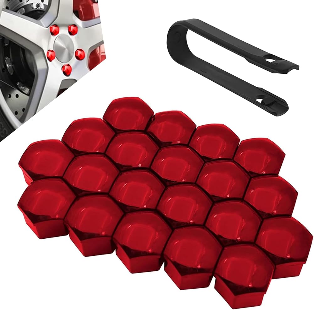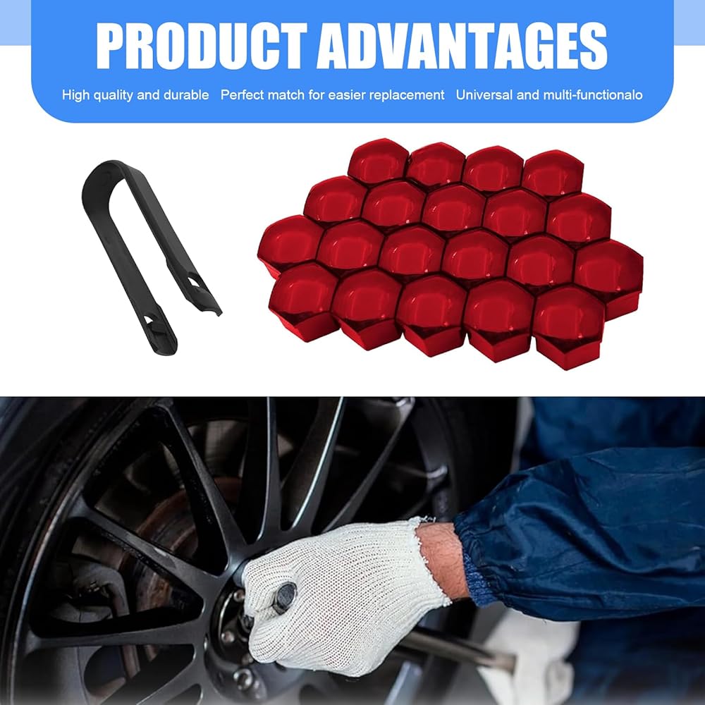 Package & Options: The package contains 20 wheel nut covers and a removal tool. Multiple colors (black, red, silver) and sizes (17mm 19mm 21mm) are available, meeting diverse needs for different vehicles.