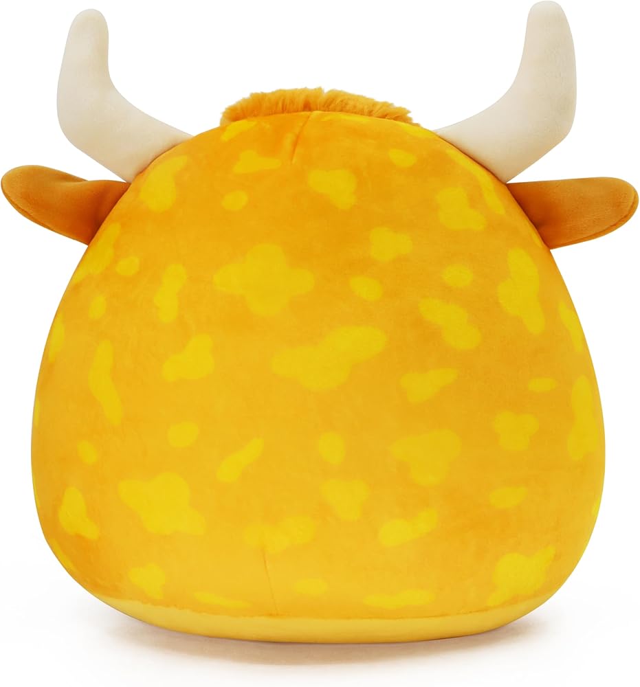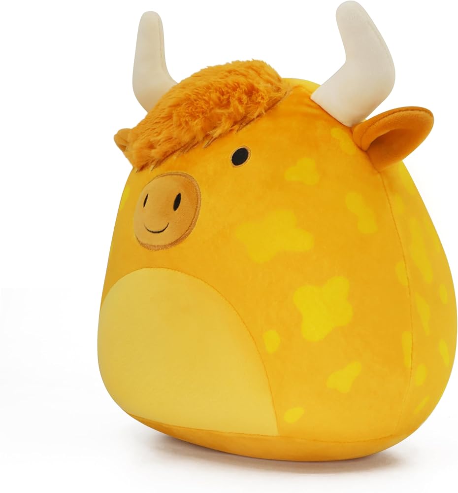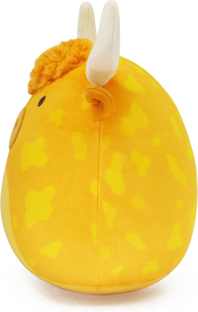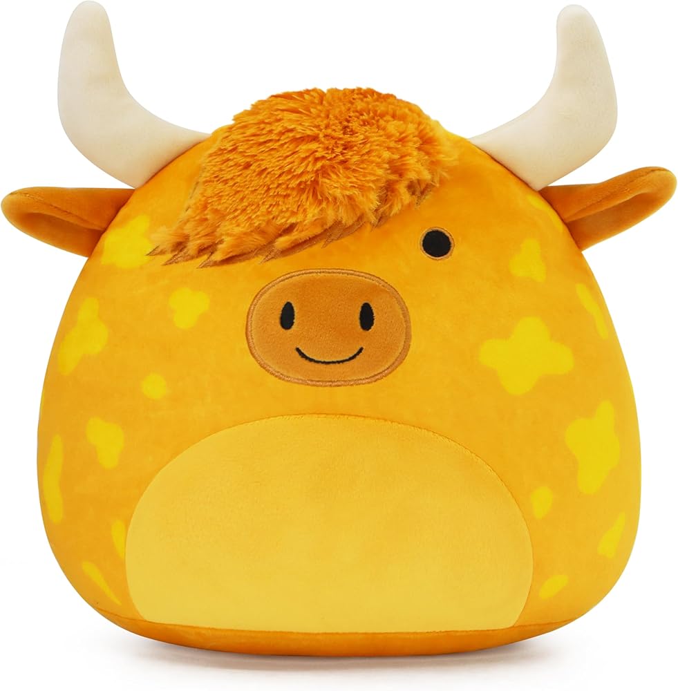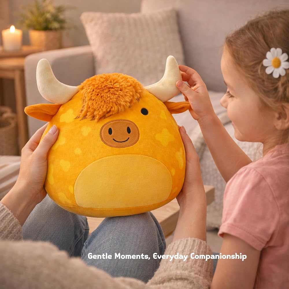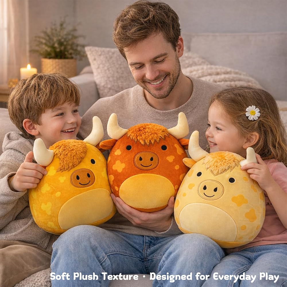 Cute Design: This plush toy features a charming Highland Cow with a round, soft body, adorable spots, a friendly smile, and charming bangs. Its quirky design captures the lovable essence of a Highland Cow, appealing to both kids and plush toy collectors.